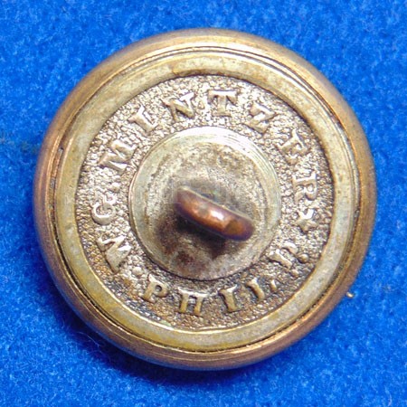 and hard like shock force troopers. The face of the button has the spread-wing eagle with the "D" shield on its chest. This denotes the dragoon branch of service. The face of the button has very nice detail remaining and a very nice amount of the original factory gold. The original back and shank are intact. It has the correct Civil War "W.G. MINTZER PHILA" maker's mark on the back. This is a great looking Civil War 21 mm uniform button.