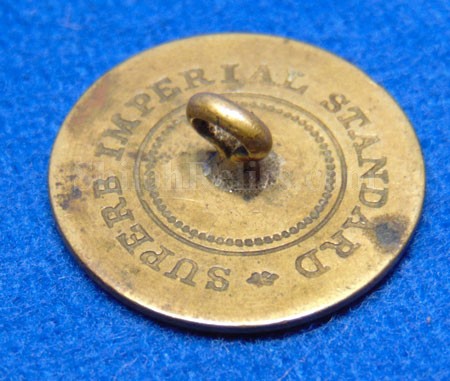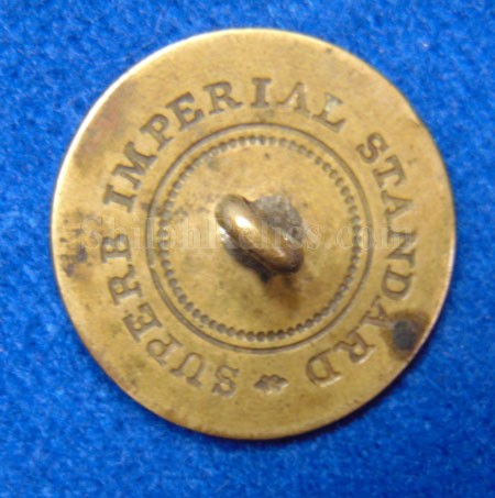 This is a great looking 1 piece coat Size New York button. It looks like it spent the last hundred years in the veterans cabin. This one has the eagle perched on the front with the word "EXCELSIOR" around the bottom. The face of the button has an untouched look with a rich patina to the brass. The back has the backmark that is nice and clear "SUPERB IMPERIAL STANDARD". This is the pattern of button listed in Albert's button book as NY10 and in Tice's button book as NY100a24. The shank is present on the back as you can see. It is a beautiful non-excavated 1 piece New York button.