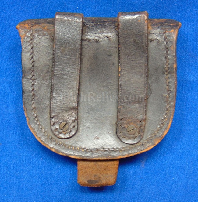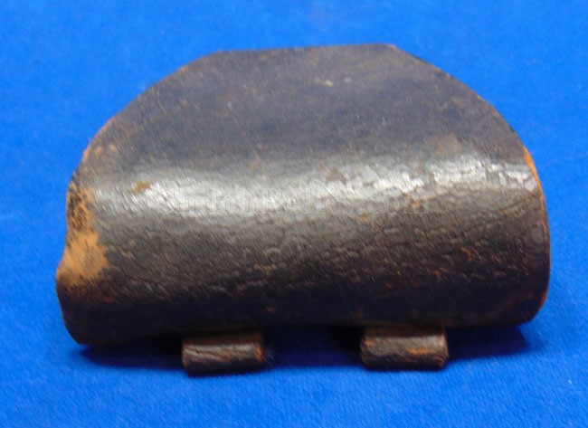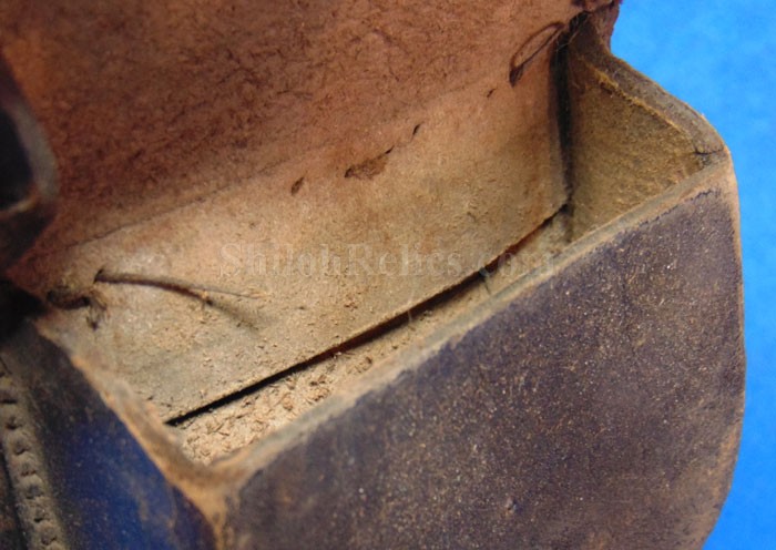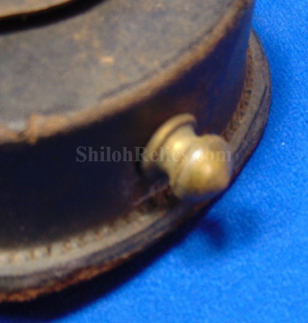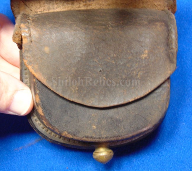 This is a nice authentic Civil War percussion capbox. It is the leather pouch that would have held the soldier's percussion caps for his pistol, carbine or musket. The closure tab and brass finial are intact and nice. On the back of the box it has both of the belt loops are present. The inner flap is present as are one of the two ears on the sides of the flap are still present. On the innermost compartment it still has had the lamb's wool removed. This wool was used to keep the caps from falling out of the box but soldiers often removed the wool to make the caps easier to get to. This one displays well and you can see that it actually saw service.
