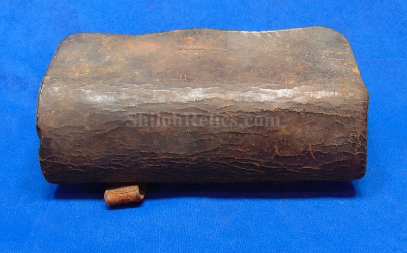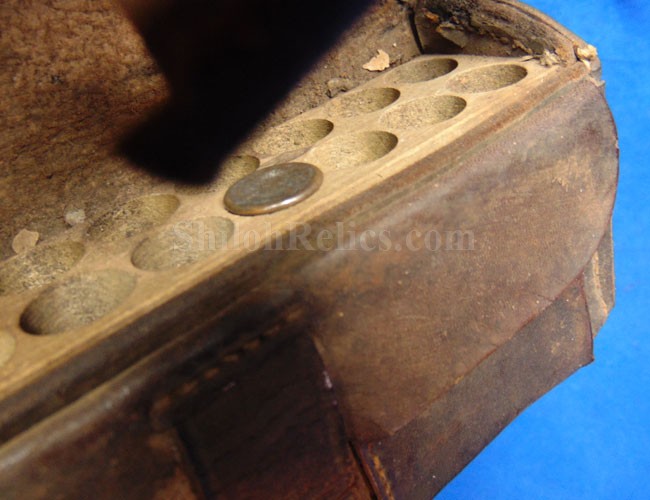 It's rough but real! This is an original Civil War era cartridge box for a cavalry carbine. This is the version that has the wooden block on the inside that has the drilled out spaces for carbine cartridges. This one fit's the .56 caliber Spencer carbine cartridges perfectly. It holds the 20 rounds of Spencer ammunition for the cavalryman. The leather is still nice and pliable with a heavily worn look. It has the brass finial intact on the bottom of the box but is missing the original roller buckles. The closure tabis present but torn. When you open up the outer flap of the box you can see the inner compartment that was designed to hold the gun tools and implements is still nicely intact. On the back of the box it has one of the original belt loops still present. The last image show how a .56 Spencer looks in the wooden block. This is a nice looking original Civil War era cavalry carbine cartridge box for a Spencer carbine or rifle.