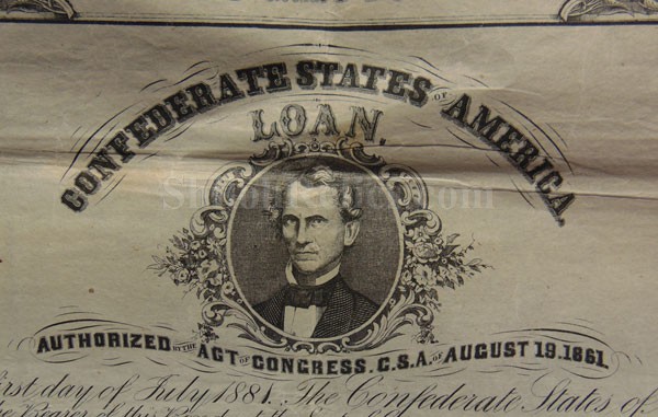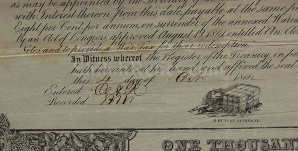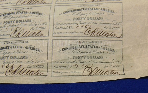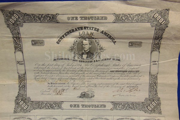 This is a great looking original Confederate States of America savings bond from 1862. Issued from the Confederate Treasury at Richmond, Virginia it is hand signed and numbered in fine old brown ink and dated October 4th 1862. This one was issued for $1,000 and paid 8% interest. In the center of the bond itself it has the likeness of one of the most important men in the Confederate Government, Christopher G. Memminger. He was the Secretary of the Confederate treasury from 1861 till 1864. Under his guidance the Confederate currency was designed and printed. The edges of the top portion have ornate designs with the $1,000 denominations. In the center of the top it has the marking stating that it was printed in Richmond, Virginia by D. Duncan Company. At the bottom of the bond there are 36 of the interest coupons remaining. This is the style listed as CR-102 in the Confederate bond book by Criswell and as #135 in Ball's book on Confederate bonds. There were only 3,457 of these bonds issued by the Confederacy and this one is 2,857. This is a nice displaying original Confederate savings bond that will look great when it is nicely framed up on you office or relic room wall.