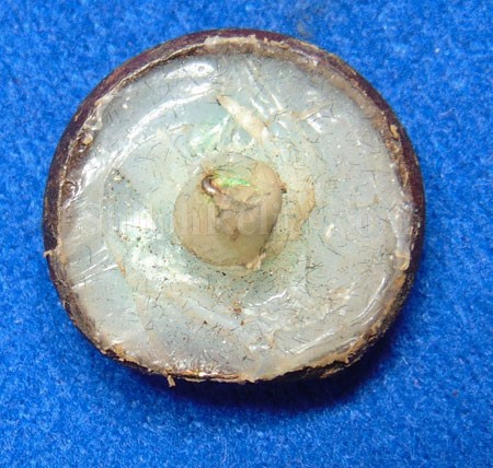 This is an original excavated face from a coat size Louisiana state seal button. This is the classic Civil War Louisiana button that has the mother pelican on the face of the button. She is feeding her young below her in her nest. This one has nice detail with the dent to the lower portion of the side. The original back and shank are lost to the ages and it has had plastic poured into the reverse to keep the shape. It is priced accordingly. It is listed in Albert's button book as LA4 and in Tice's button book as LA210. This is a nice displaying button for the price.