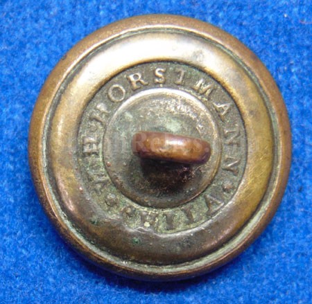 Here is an original non-excavated coat size Civil War era Dragoon button. The dragoon branch of service was a group of mounted rifleman. The face of the button has the spread-wing eagle with the "D" shield on its chest. This denotes the dragoon branch of service. The face of the button has very nice detail remaining. The original back and shank are intact. It has the correct "W.H. HORSTMANN PHILA" maker's mark on the back that is clearly visible. This is a great looking Civil War 20mm uniform button.
