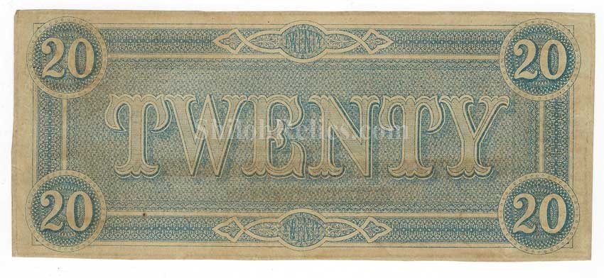 This is a very nice original 1864 dated Confederate States of America twenty dollar note. This is the note issued by the Confederate States of America with the Tennessee state capitol in the middle. In the lower right hand corner is the likeness of Confederate Vice-President Alexander Stephens. On the back of the note it has the large "TWENTY" in the center surrounded by ornate designs and "20" on the corners. This bill is in attractive displaying circulated condition with some wear around the edges. It is the pattern listed as figure T-67 in Criswell's book on Confederate currency. It is correctly hand signed and numbered. This note comes in an acid free holder for display and preservation.
