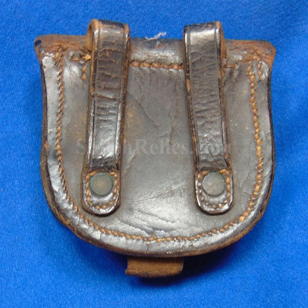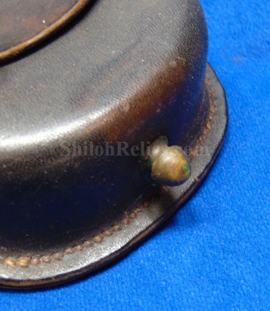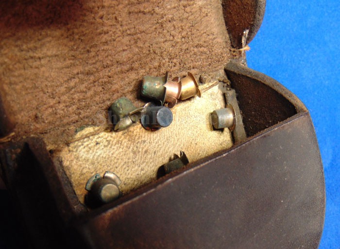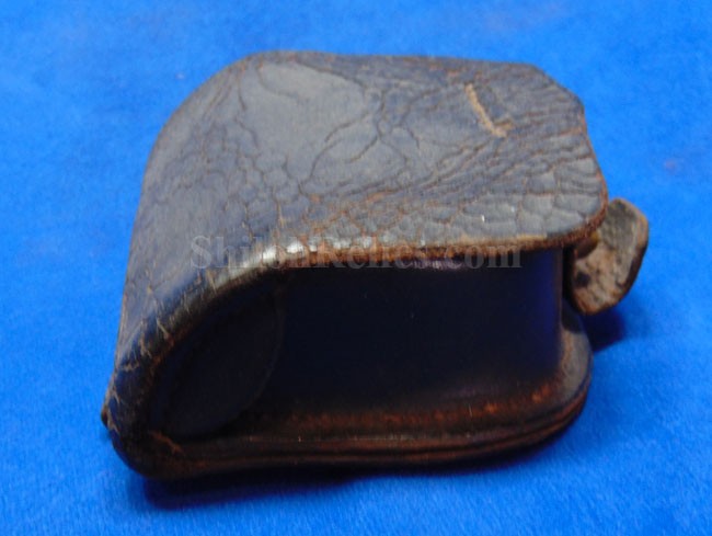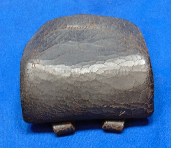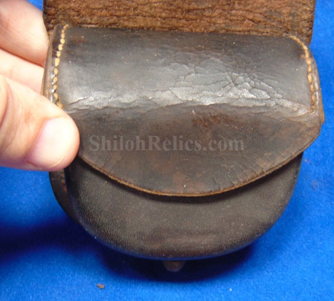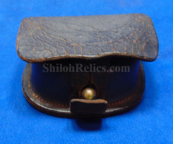 This is a great displaying Civil War leather box that held the percussion caps for muskets, pistols or carbines. This one is in very nice shape and has a very attractive well worn look. It has one of the original two sewn style belt loops intact on the back of the box. On the outer flap it has the closure tab intact as well as the brass finial intact. If you notice this is the style of outer flap that is known to collectors as the "Shield" style front with the applied closure tab. This style is generally earlier in production. The inner flap is nice and has both of the "ears" present on the sides. On the inner pocket it has had the lamb's wool removed. The wool was often removed by the soldier to make the percussion cap easier to get to. There are even some original percussion caps inside the box. This is a nice displaying original classic Civil War percussion cap box.