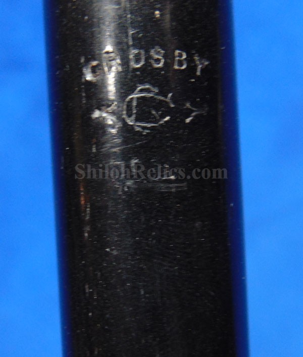 This is a beautiful original post Civil War era dark wooden fife. This is a high quality version that measures 17 inches in overall length. It also has the original silver tips on each end of the fife's body. These were designed to protect the fragile wooden ends of the fife from chipping. It is the classic Civil War style that was carried and used by musicians from slightly after the Civil War. The wood has a very pleasing dark color all over. On the side of the wood it has the maker's Mark of "CROSBY / GC". The Crosby company was one of the premier makers of Civil War fifes. The company owned by Walter Crosby was located in Boston as early as 1852 but according to research this version would have been made after 1868. It even has an original pewter "Cheater" to make it easier to play. It will still make a superb display piece for your Civil War era campsite display.