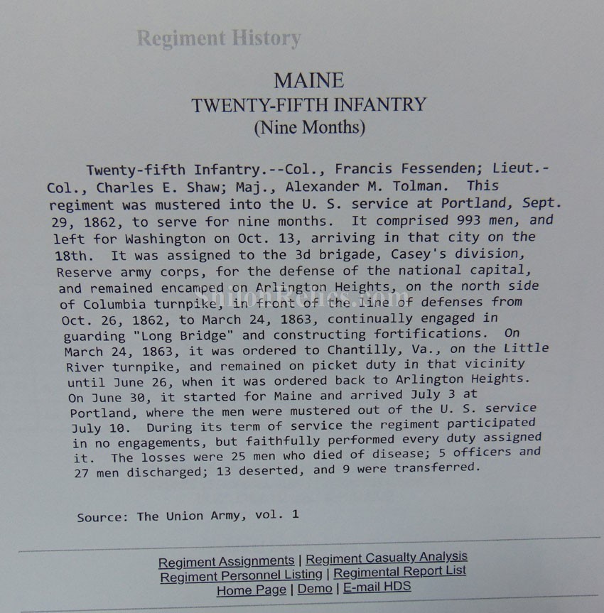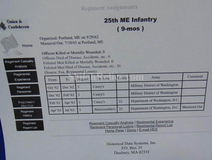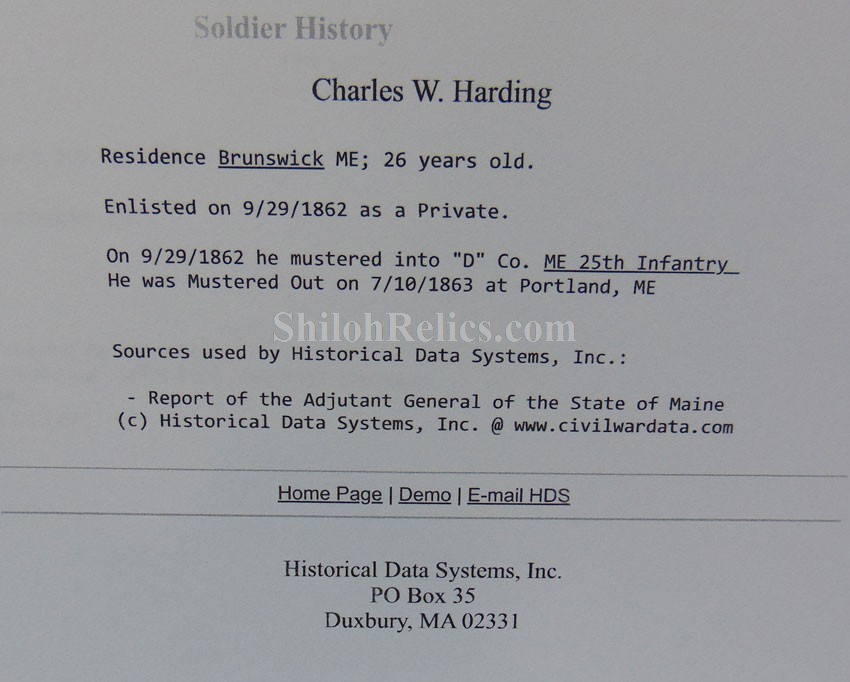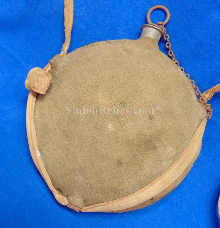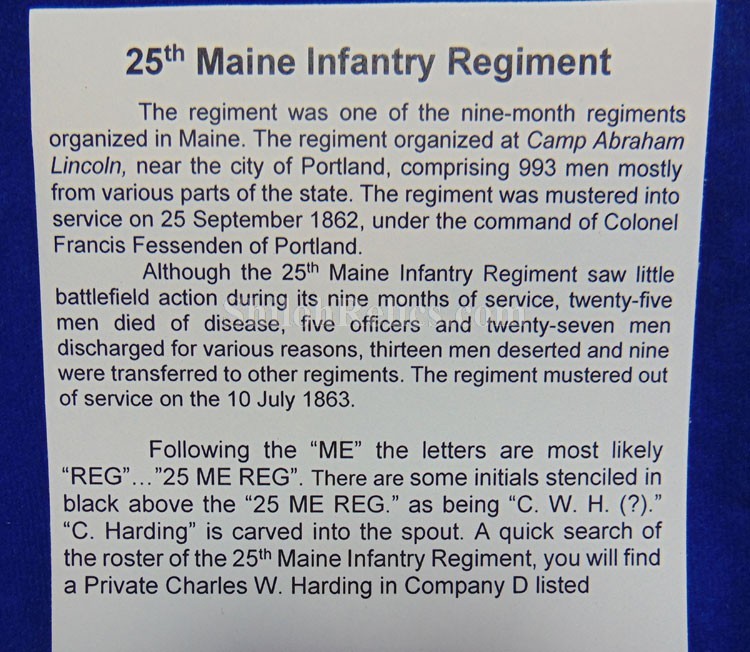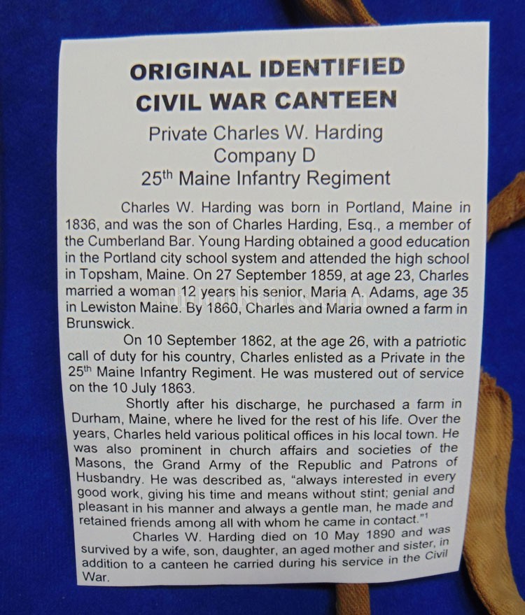 This is a great original Civil War soldier's canteen. This is a smooth side pattern of 1858. This is the canteen that was often used by soldiers on both sides of the Civil War. This one has the original pewter spout intact at the top of the canteen. Inside the spout it has the original cork and metal stopper with the chain intact as well. On the sides of the canteen it has the three original strap loops intact. This one is in fine shape and has the original cover still intact with a nice used but not abused look. The canteen still has the original shoulder strap present. What makes this one special is the stamping that is on the side of the body cover. It is stenciled by the owner. It has "C.W.H." and Co. D" and along the bottom it has the "25 ME REG.". It is also carved "Harding" on the side of the pewter spout. I had a time waster order this canteen and sent it back because they letters weren't clear enough. As you can see in all 21 pictures, they are faded but legible and there is no doubt of what they are. The records show that Charles W. Harding was a private in the 25th Maine Infantry. The paperwork that accompanied the sword says that he enlisted on September 10th 1862 and served with the 25th Maine Infantry until July 10th of 1863. They spent their service guard and building up the fortifications around Washington, D.C. A printout of his service as well as that of the 25th Maine will accompany the canteen. This will be a fine piece to add to your soldier's personal items collection.
