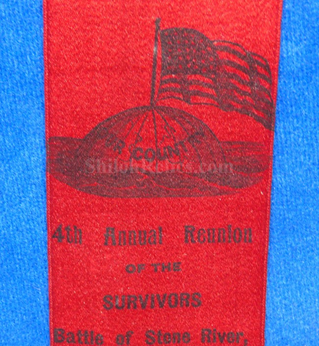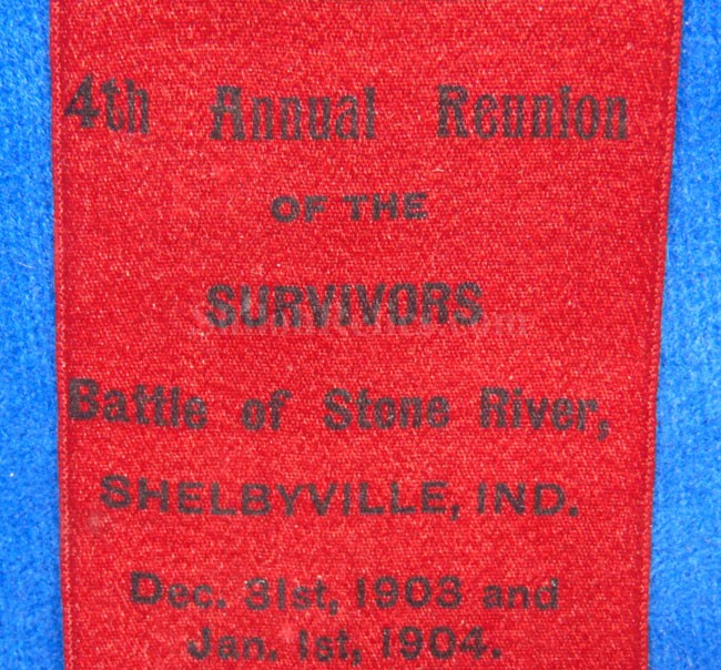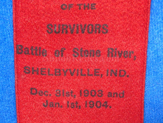 This piece is the only one of these ribbons I have ever seen. This is a 1903-04 dated reunion ribbon commemorating the Survivors of the Battle of Stone River in Murfreesboro, Tennessee. The ribbon displays well but has the fraying at the top as you can see in the images. The deep red silk ribbon has the black ink printing. It has the image of the flag and globe at the top. The lettering proudly states "4th Annual Reunion / of the /Survivors / Battle of Stone River / SHELBYVILLE, IND. / Dес.
