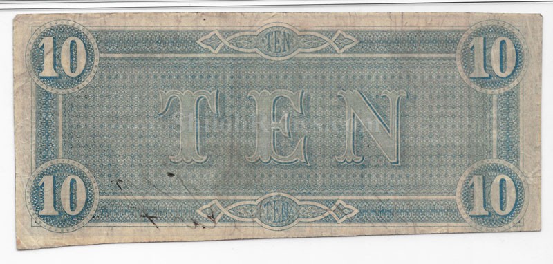 This is a fine original 1864 dated Confederate States of America $10 bill. This is the version issued in February 17th of 1864. The scene in the center has the soldiers on horseback pulling the cannon into battle. In the lower right hand corner is the likeness of Robert Hunter who served as Confederate Secretary of State and a C.S. Senator. Before the War he was a U.S. Congressman and Senator from Virginia. This one is nicely hand signed and numbered as it should be. On the back of the note it has the ornate blue printing with the large "TEN" in the center. The note is in attractive circulated condition and is 100% authentic. It has been professionally graded by the PMG Company and they graded it as "Very Fine". This is the pattern known to collectors as T-68 in Criswell book on Confederate Currency. The note comes in the PMG Company's acid free holder for display and preservation.