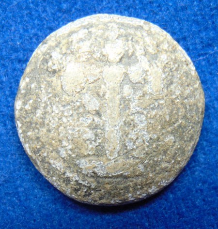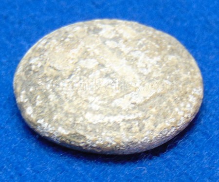 This is a scarce button. It's rough but real. This is the excavated coat size state seal uniform button for the state of South Carolina. This is the pattern that is solid cast out of white metal. They are Confederate copies of the pre-Civil War South Carolina state seal buttons. It has the palmetto tree on the face of the button with the motto around the side. The motto reads "Animis Opibusque Parati" which translates as "Prepared in mind and Resources." As you can see the face of the button retains only faint traces of the detail and is priced accordingly. The original integrally cast shank has been lost to the ages from the reverse. This is a variant of the button that is listed as figure SC284 in Tice's button book. This one is in excavated shape and has a cool look.