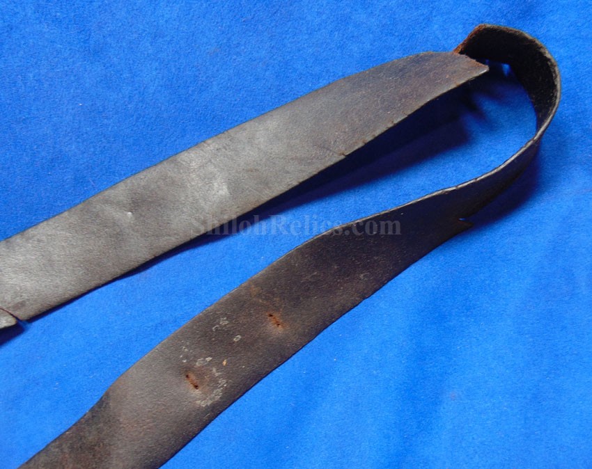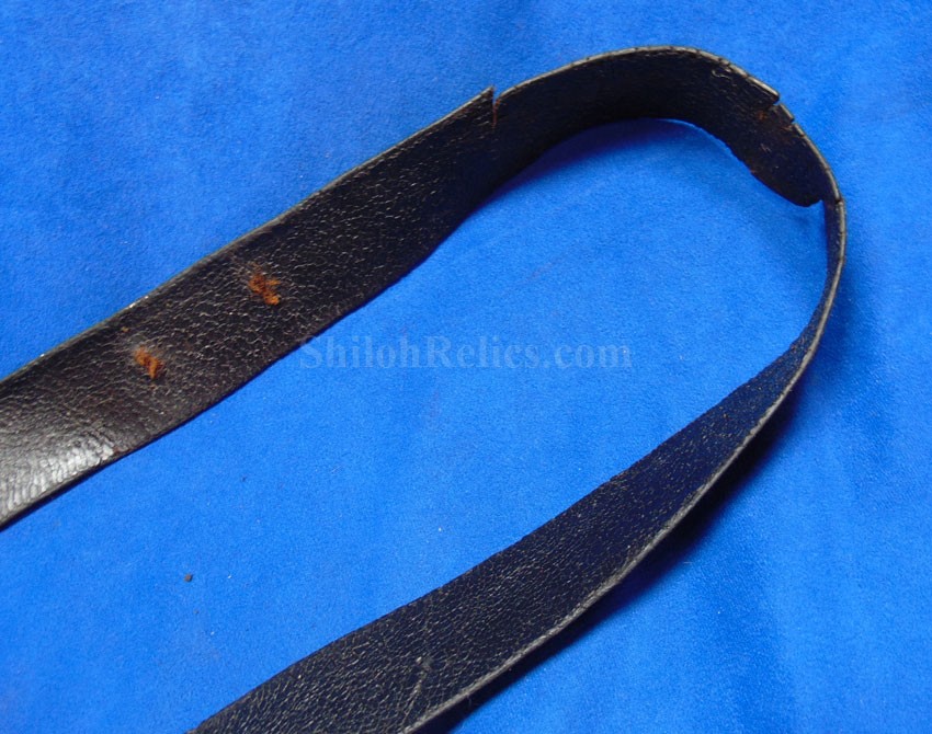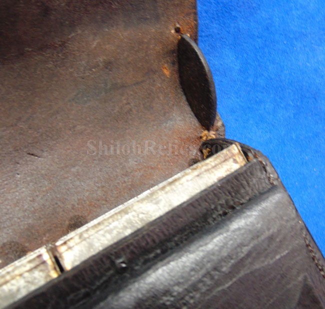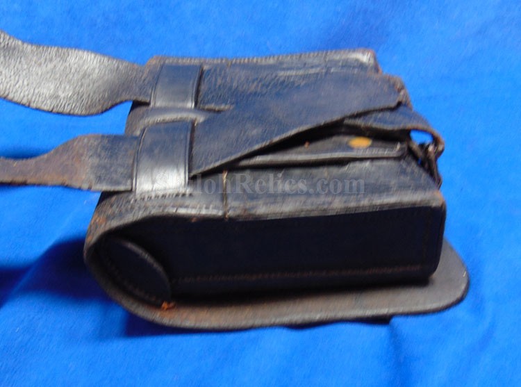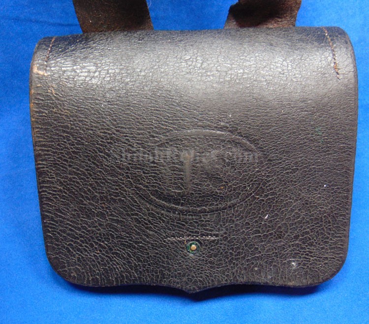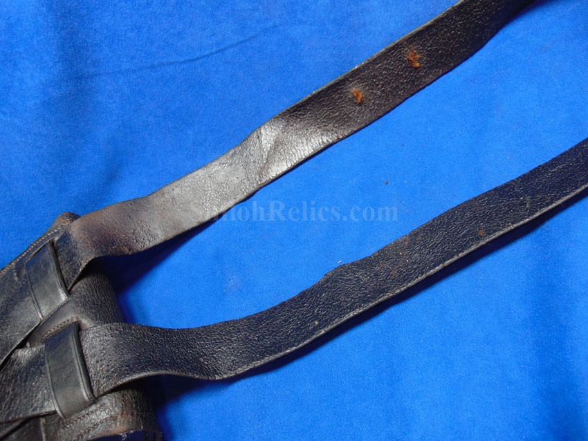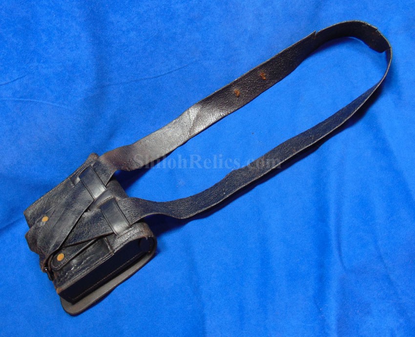 This is a very nice piece! It is an original Civil War soldier's cartridge box. This is the classic .69 caliber style that was used during the Civil War. The outer flap still has the very nice original "US" cartridge box plate present with nice clear lettering. When you raise the outer flap you are greeted by the inner flap of the implement compartment. These Oliver boxes were made without the standard inner flap and since they didn't use the inner flap they would sew the "ears" directly onto the outer flap. The "ears" are missing from this one. The inner flap has the remnants of the Civil War maker mark of H.W. Oliver from Pittsburg, Pennsylvania. According to the maker book Oliver only had army contracts for cartridge boxes in 1863 and 1864. That lets us know that this one is definitely a Civil War production cartridge box. These model 1864 .69 caliber boxes were often issued to the western theater soldiers that were suing the outdated smoothbore rifles and muskets. The innermost compartment has the original tins intact with a fine look. On the bottom of the box it has both of the original roller buckle as well as the finial and the closure tab. The box has the original leather shoulder sling intact. These were issued without an eagle breastplate but you can see the slits on this one where it was cut for a plate at one time. There are couple of tears int he leather of the sling but as you see, it displays quite well. This is a fine displaying set that will look great beside your Civil War .69 caliber musket or rifle.