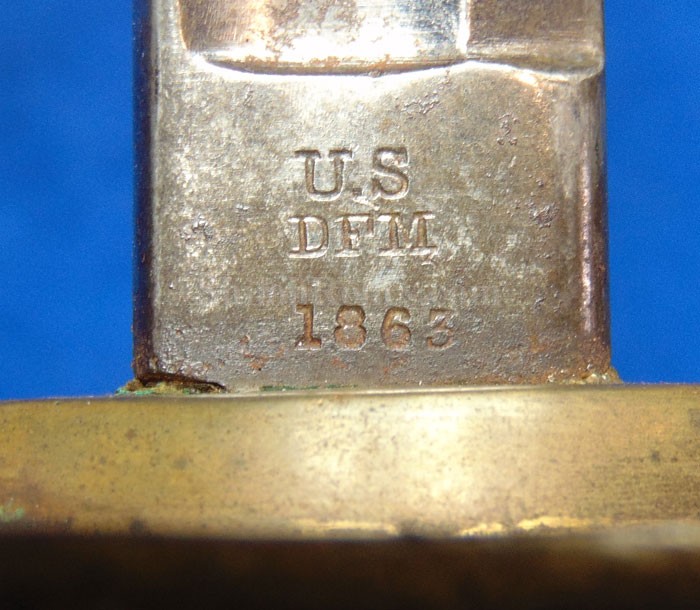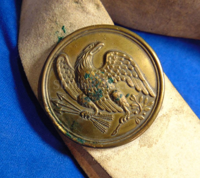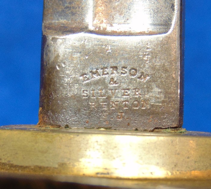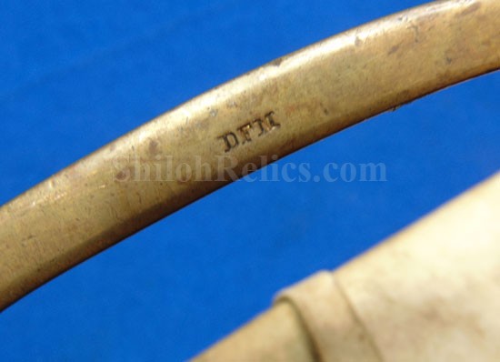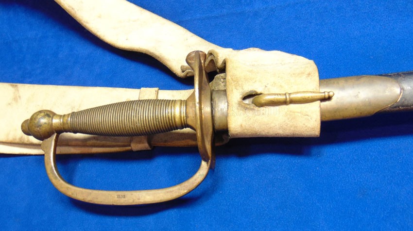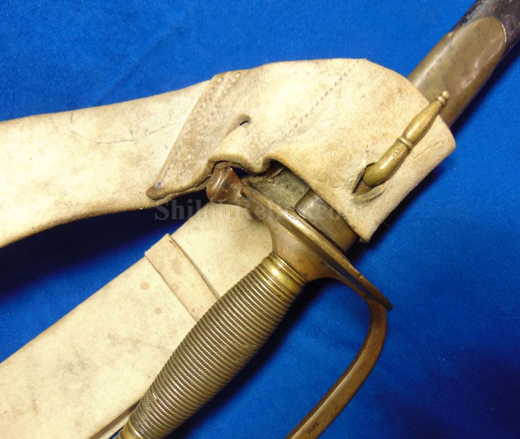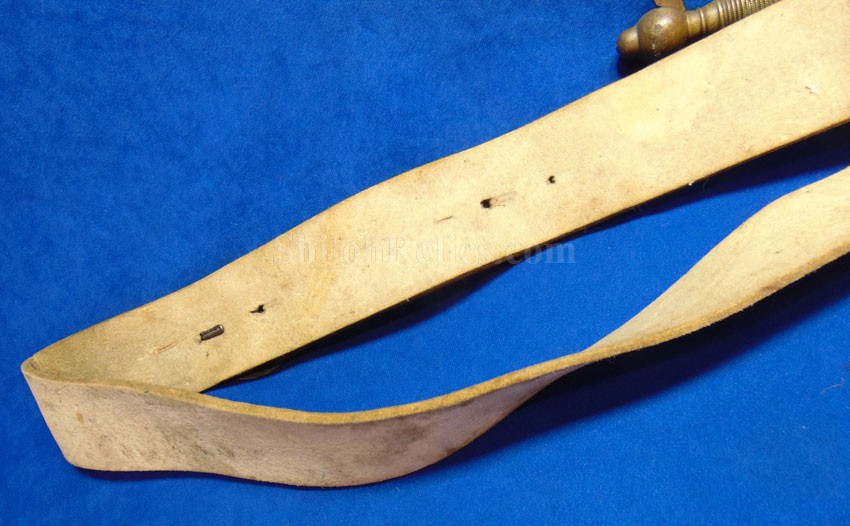 Here is a very cool piece that you very seldom see offered for sale. It is an original white buff leather shoulder sling for a sword. This is the version that was made to hold the Non-Commissioned officer's sword and scabbard. These would also fit the Civil War musician's sword. The leather is still pliable and is in wonderful condition. It has the sewn frog style hanger. The leather is still nice and pliable and as you can see it displays quite well. It has the scarce 3 hook shoulder belt plate that also acts to adjust the length of the leather strap. It has all three of the original double twist iron wire hooks intact. Another thing that makes this one special is that it has a nice original N.C.O. Sword. This is a nice looking original Civil War sword & scabbard for the non-commissioned officer. This one has a full-length blade and it has the maker's mark of the firm of Emerson & Silver of Trenton, New Jersey at the base. Emerson made many fine quality edged weapons during the Civil War for the United States government including this one. On the base of the blade front it has the production date of 1863 which is a nice war date for their swords. It has the "DFM" inspector initials on the brass bow of the handguard. These are the initials of Dexter F. Mosman who inspected swords for the U.S. Government. The hand guard, grip and pommel cap are made of brass and they all have a very pleasing medium patina color. On the bow of the hand guard it also has the "DFM" marking. The sword is accompanied by the original metal and brass scabbard. These Emerson N.C.O. swords used a metal and brass construction compared to the leather and brass scabbards others used. This is an attractive Civil War dated N.C.O. Sword by Emerson & Silver with a full-length blade and the original scabbard that you can tell was used but not abused. You get the sword and the shoulder sling.
