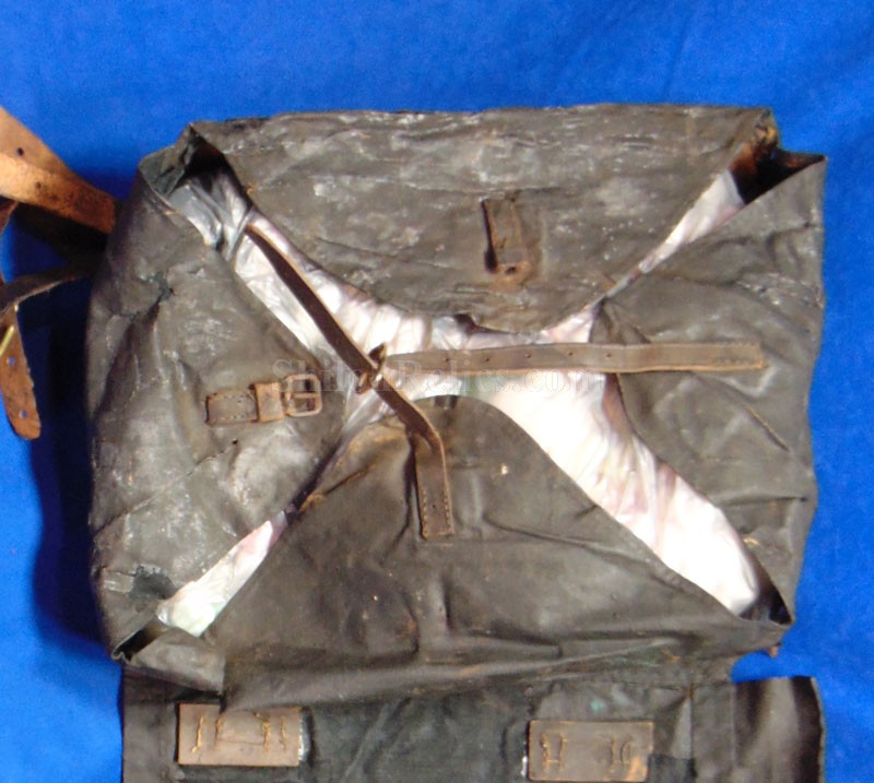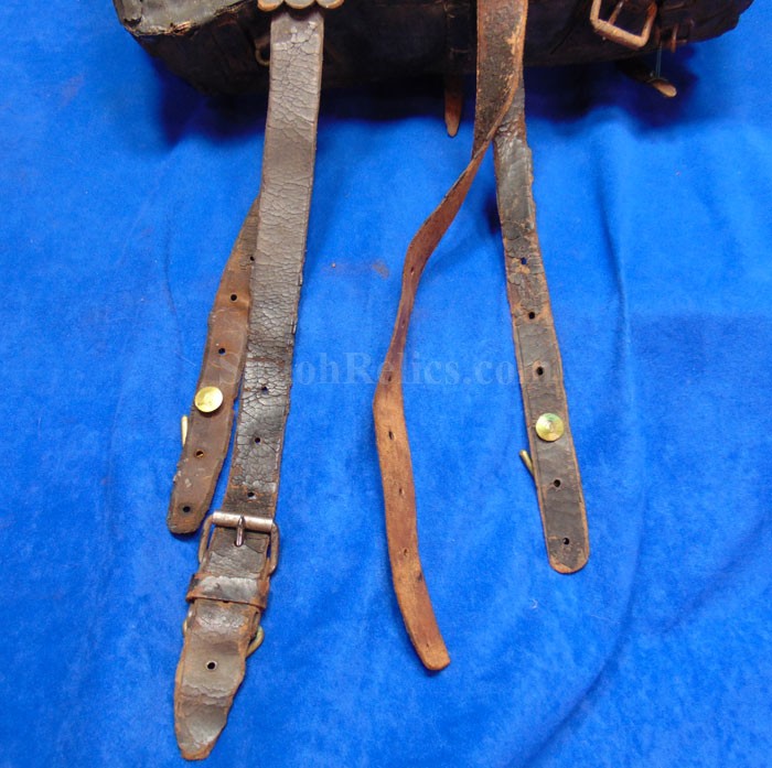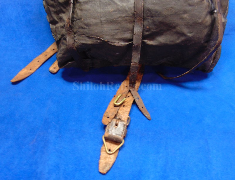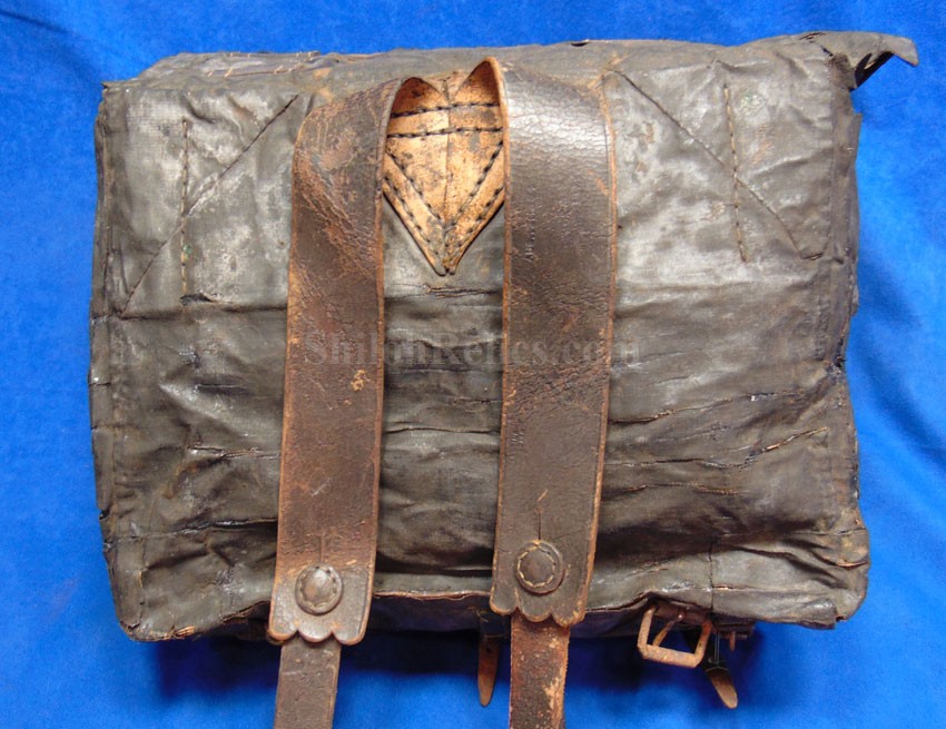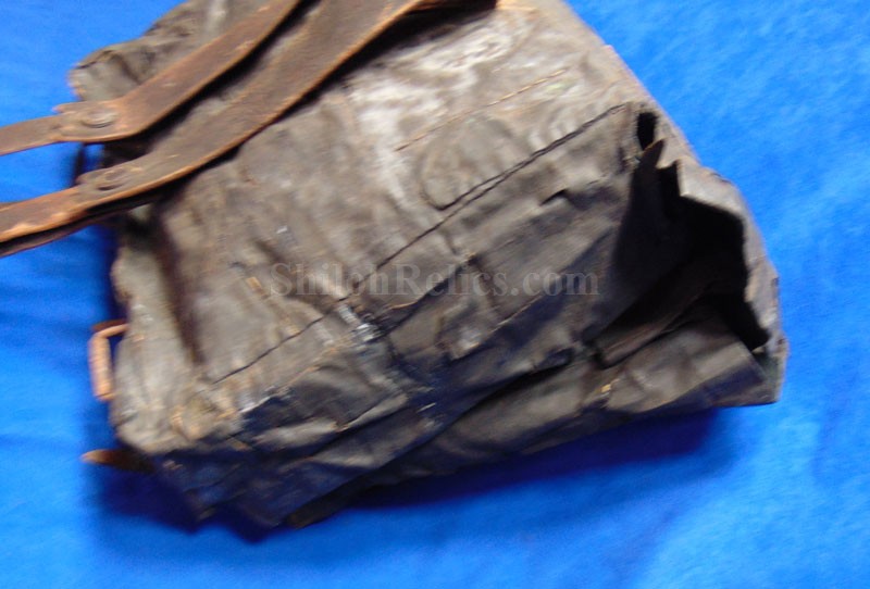 This is a piece that is becoming tough to come across anymore. It is the authentic original of the Civil War soldier's tarred canvas knapsack. This style was heavily used by the soldiers from the North during the Civil War. This one is better than most of them that you encounter. It still retains the straps coming off of the back and it has the brass and iron buckles and hooks intact as well. On one of the straps you can still read a very small portion of the maker's name of "E. ROBINSON" who had contracts for the '