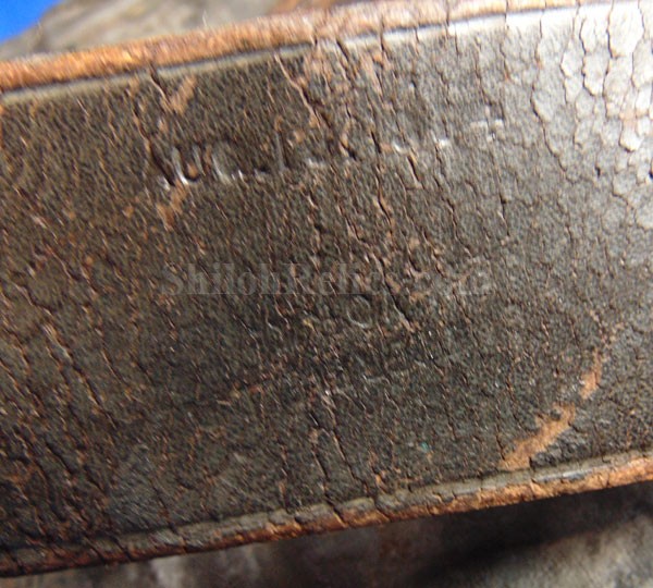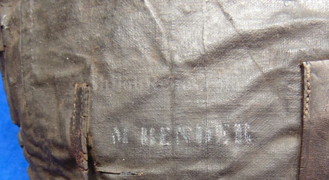 U.S. Government for both knapsacks and is the same man that had the military rifle contract. The strap also has the inspector stamping of Valentine. The other strap has the contract date of "AUG 2 1864". It is tough to find one of these that has clear markings but this one is very nice. According to the maker book he had government contracts in 1864 for 250,000 knapsacks. The canvas has an attractive appearance and has been stuffed on the inside to enhance the overall look. It has some wear and flaking to the finish on the leather and canvas as you can see but it still displays well. There are few spots that have been reinforced for preservation. It has a name and regiment stenciled on the outer flap but in my opinion, these markings were added more recently. This is a fine display piece for your relic room that costs less than what a cartridge box costs these days.