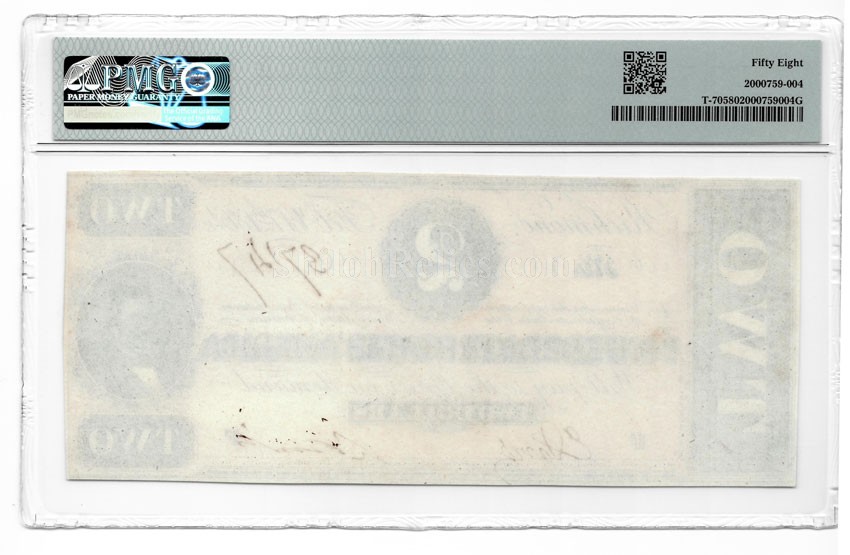 This is a beautiful original 1864 issue of the $2.00 bill. Along the top of the note it has the Richmond Virginia, location of issuance and the printed date of issuance of February 17th 1864. On the right hand side it has Judah P. Benjamin from the Confederate Cabinet. Benjamin was from Louisiana and held many important positions in the Confederate Government. At different times during the Civil War he served the Confederacy as Attorney General, Secretary of War and Secretary of State. At the end of the Civil War he fled to England and practiced law rather than live under U.S. rule. This is the version listed as figure T-70 in Criswell's Confederate Currency book. It is nicely and correctly hand signed and numbered in old ink. It is in beautiful un-circulated condition. It was professionally graded by the PMG Company and they rated it as "Choice About Uncirculated" and they note that it was printed on Premium Paper Quality. This note comes in their acid free holder for display and preservation. What a cool note in beautiful condition.