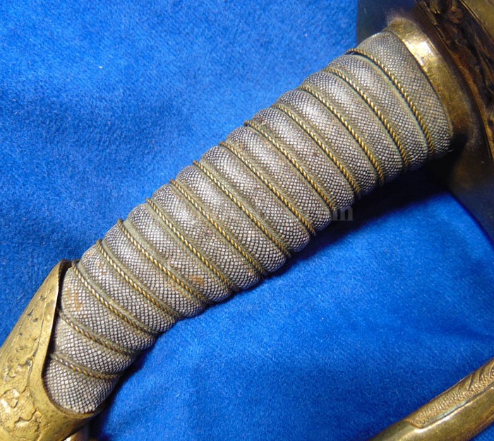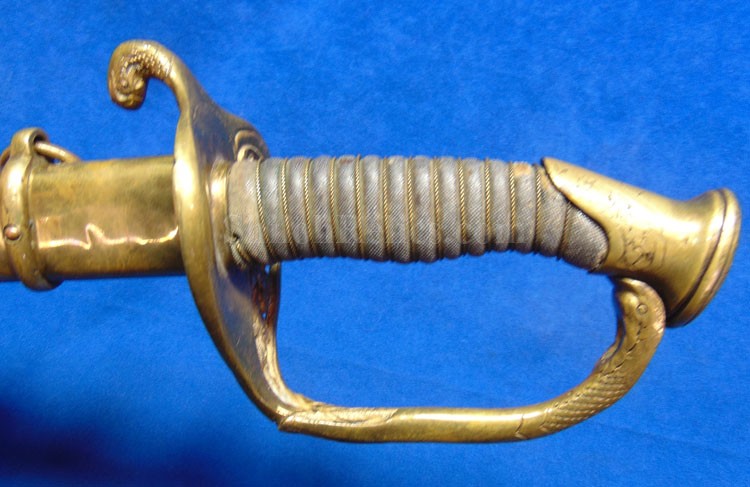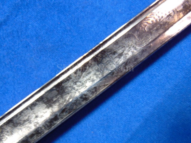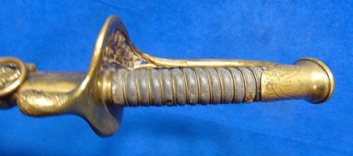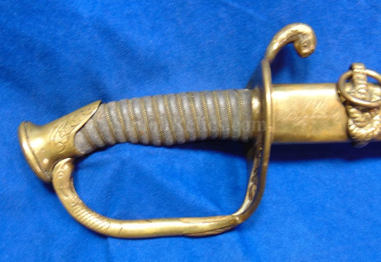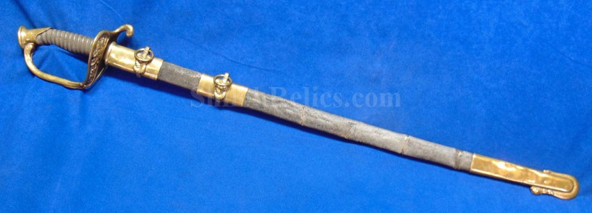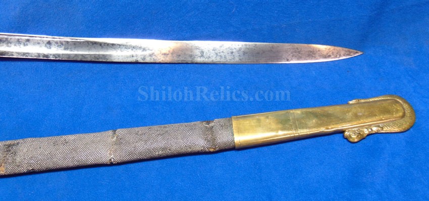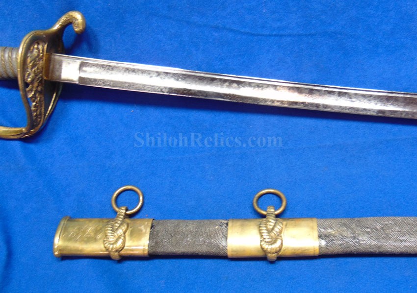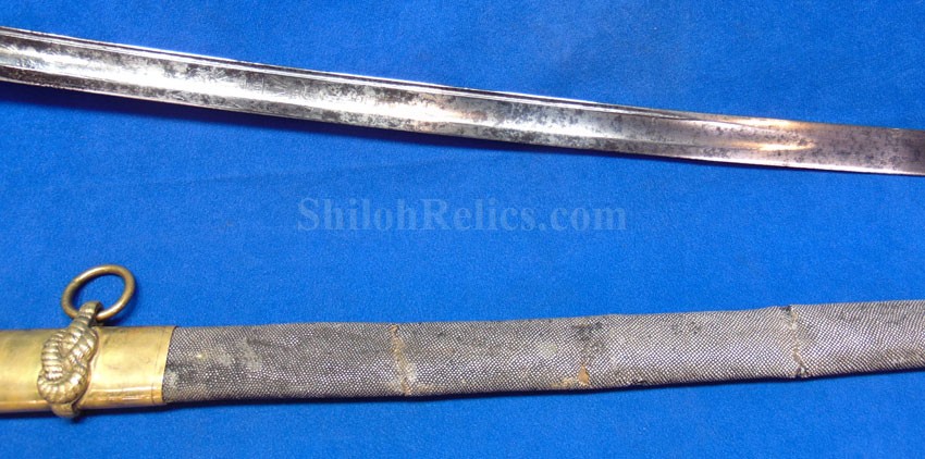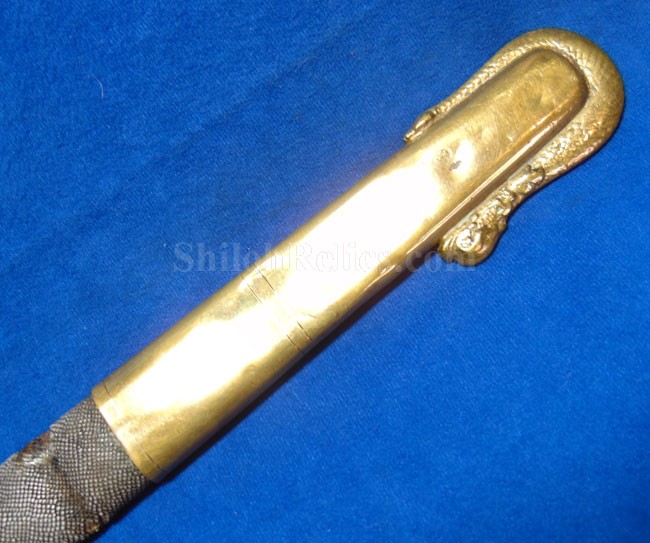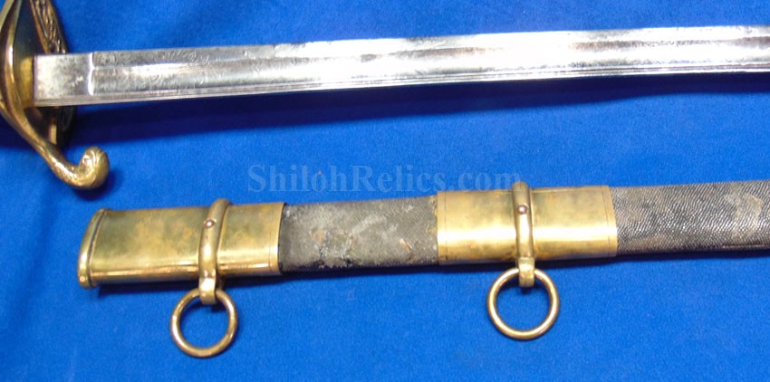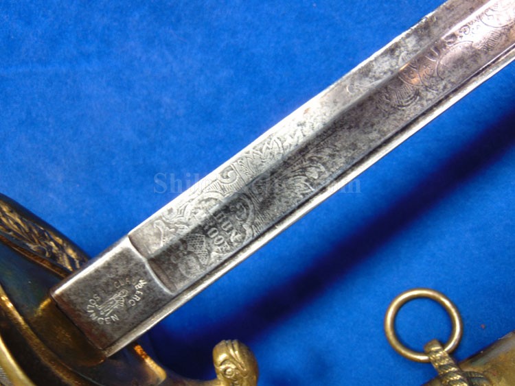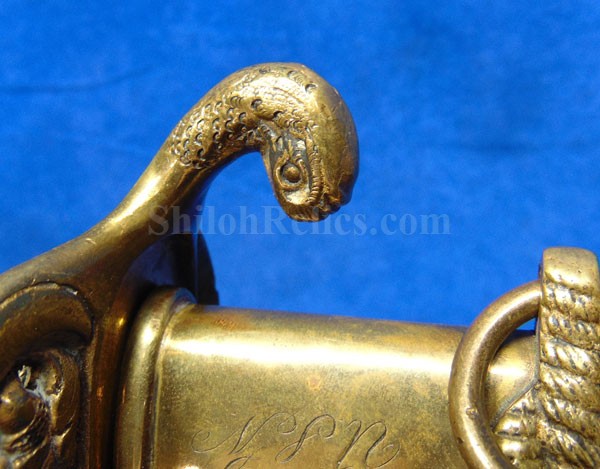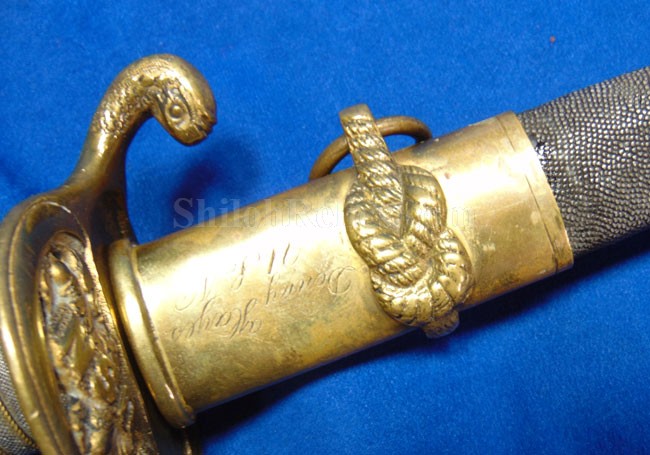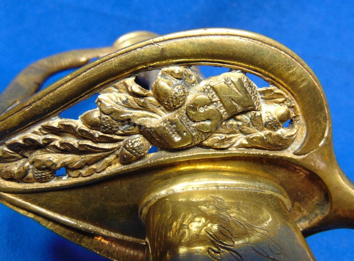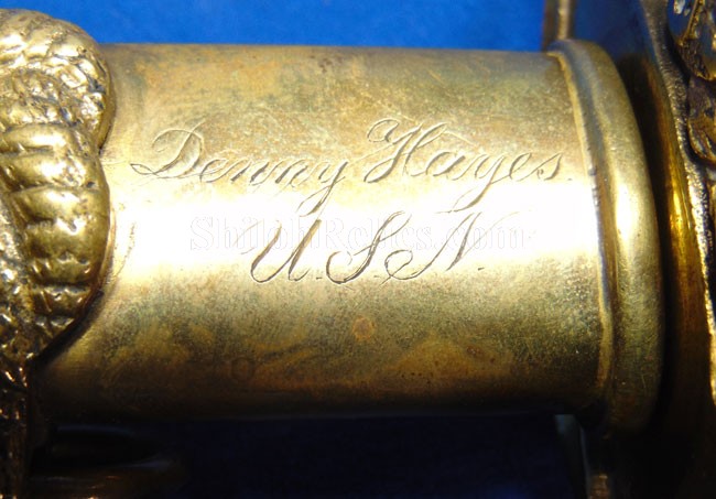This is a classic original Civil War naval officer's sword. Officially known as the U.S. model 1852 naval officer's sword, this is the style that was worn by naval officers during the Civil War. The blade is full length and is etched on each side with patriotic and other designs. The etching on the back of the blade has anchor as well as the flags and spears with "USN" on the banner. At the base it has the "IRON PROOF" marking. This is a quality marking that states that the steel of the blade was good enough quality to cut through iron. On the back side of the blade it has the stamping of knight in armor. This stamping lets us know that the sword was manufactured by the firm of W. Clauberg of Solingen, Germany. They manufactured many quality edged weapons for the union during the Civil War. The front of the blade has the perched Union eagle at the base. The it has the anchor with the "US" lettering above. The guard and pommel cap have always stood apart from the normal Civil War officer's sword. It has the bold "USN" in the basket of the guard and the quillion is made like a serpent's head. At the very top of the pommel cap it has the droop wing style naval eagle. If you notice that all of the brass parts have a beautiful untouched patina. This one has a superb amount of the original sharkskin grip present on the handle with a pleasing look all over. It also has the original double twist wire intact on the handle as well. The sword is accompanied by the original scabbard that is made brass and sharkskin. The sharkskin is still solid with a few wear lines. The mounts are the correct naval style with the twisted rope designs leading to the rings. What makes this one extra special is the inscription on the top mount of the sword. It has the jeweler quality inscription of "Denny Hayes" over the "USN". The folks at the FOLD3 research website had some information on him. He is listed as a "Mate" on June 7th 1864. He was promoted to Acting Ensign on November 18th 1864 and was honorably discharged on October 21st 1865. It deserves more research but we will leave that for you. The drag is present and it has the sea serpent design as well. This is an attractive looking original Civil War naval officer's sword and scabbard with a fine identification.