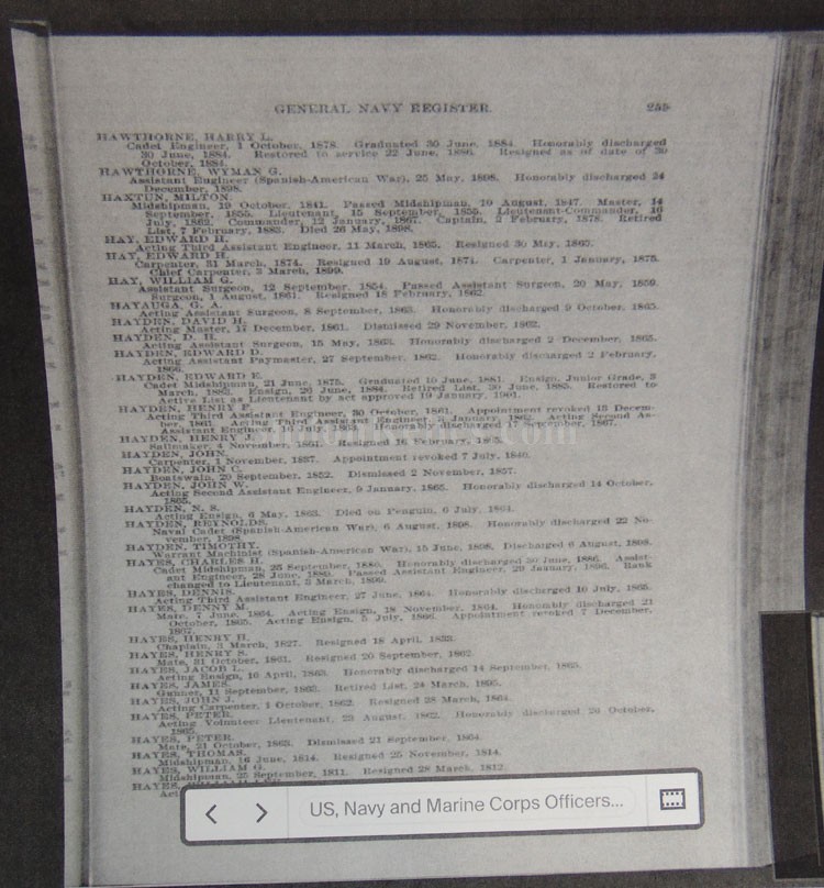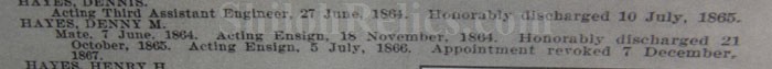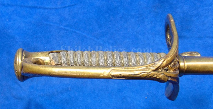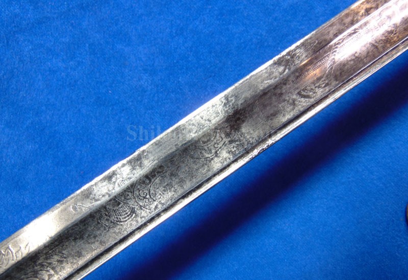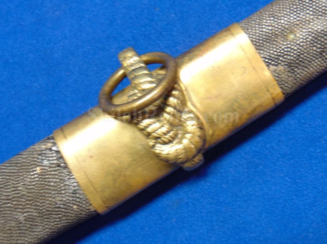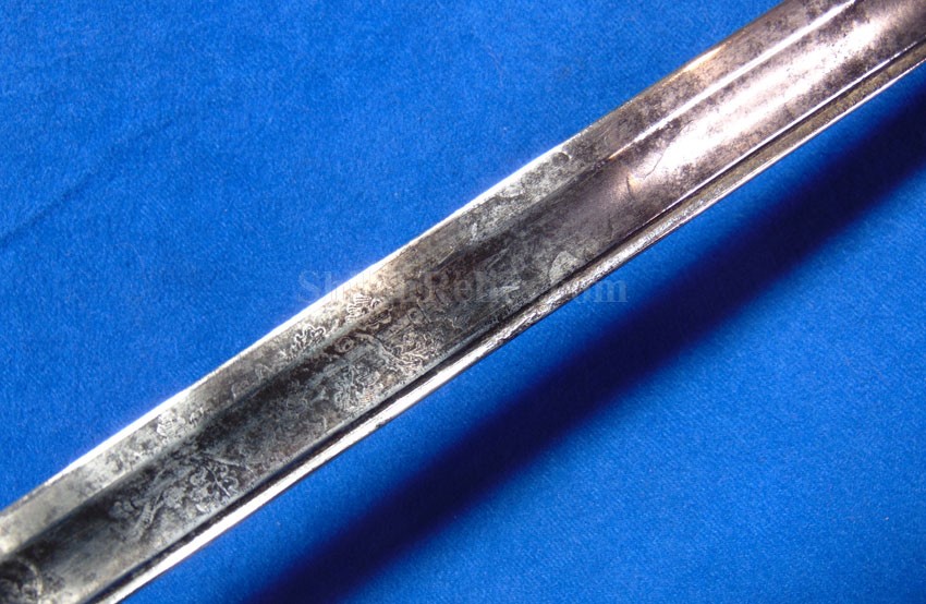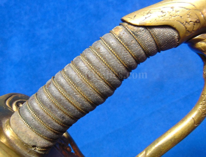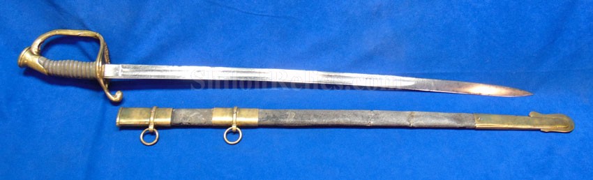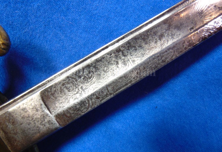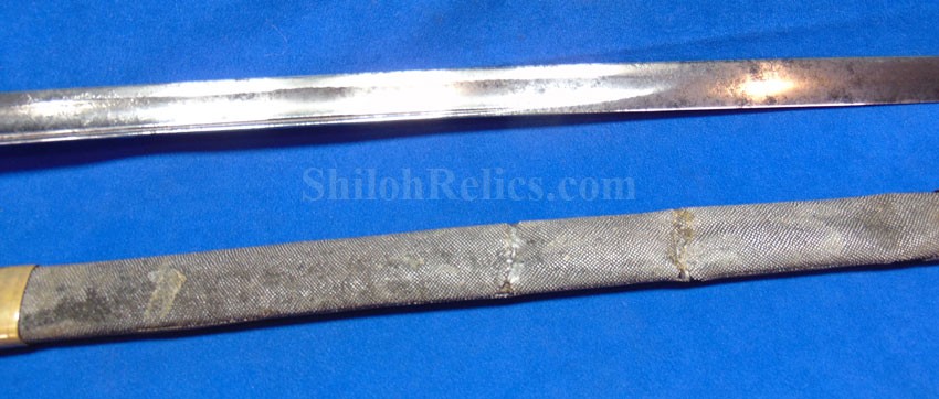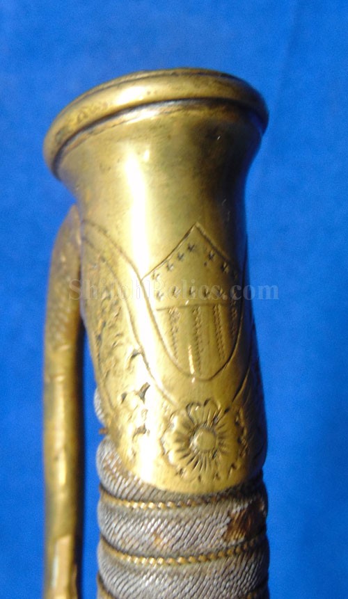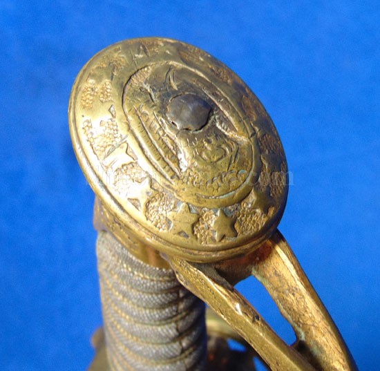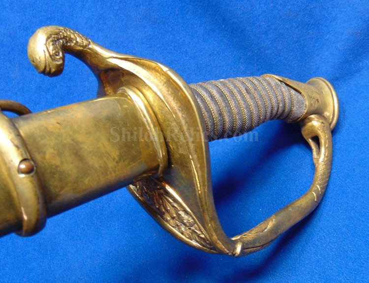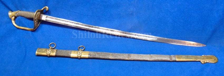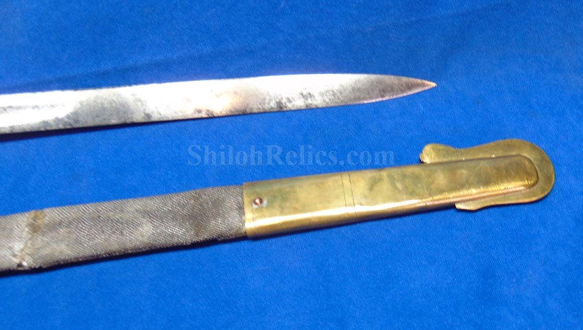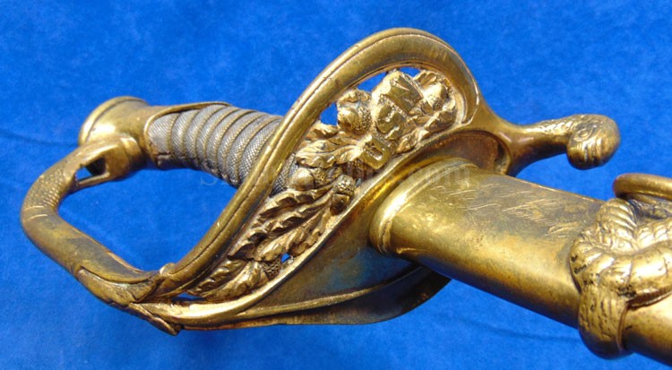 This is a classic original Civil War naval officer's sword. Officially known as the U.S. model 1852 naval officer's sword, this is the style that was worn by naval officers during the Civil War. The blade is full length and is etched on each side with patriotic and other designs. The etching on the back of the blade has anchor as well as the flags and spears with "USN" on the banner. At the base it has the "IRON PROOF" marking. This is a quality marking that states that the steel of the blade was good enough quality to cut through iron. On the back side of the blade it has the stamping of knight in armor. This stamping lets us know that the sword was manufactured by the firm of W. Clauberg of Solingen, Germany. They manufactured many quality edged weapons for the union during the Civil War. The front of the blade has the perched Union eagle at the base. The it has the anchor with the "US" lettering above. The guard and pommel cap have always stood apart from the normal Civil War officer's sword. It has the bold "USN" in the basket of the guard and the quillion is made like a serpent's head. At the very top of the pommel cap it has the droop wing style naval eagle. If you notice that all of the brass parts have a beautiful untouched patina. This one has a superb amount of the original sharkskin grip present on the handle with a pleasing look all over. It also has the original double twist wire intact on the handle as well. The sword is accompanied by the original scabbard that is made brass and sharkskin. The sharkskin is still solid with a few wear lines. The mounts are the correct naval style with the twisted rope designs leading to the rings. What makes this one extra special is the inscription on the top mount of the sword. It has the jeweler quality inscription of "Denny Hayes" over the "USN". The folks at the FOLD3 research website had some information on him. He is listed as a "Mate" on June 7th 1864. He was promoted to Acting Ensign on November 18th 1864 and was honorably discharged on October 21st 1865. It deserves more research but we will leave that for you. The drag is present and it has the sea serpent design as well. This is an attractive looking original Civil War naval officer's sword and scabbard with a fine identification.