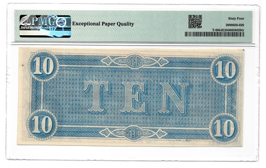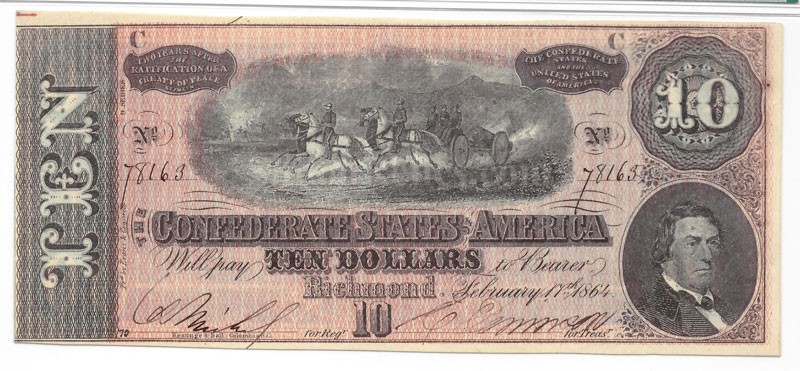 This is a great original 1864 dated Confederate States of America $10 bill. This is the version issued in February 17th of 1864. The scene in the center has the soldiers on horseback pulling the cannon into battle. In the lower right hand corner is the likeness of Robert Hunter who served as Confederate Secretary of State and a C.S. Senator. Before the War he was a U.S. Congressman and Senator from Virginia. This one is nicely hand signed and numbered as it should be. On the back of the note it has the ornate blue printing with the large "TEN" in the center. The note is in attractive almost un-circulated condition and is 100% authentic. It has been professionally graded by the PMG Company and they graded it as "Choice Uncirculated" and note that it was printed on "Exceptional Paper Quality". This is the pattern known to collectors as T-68 in Criswell book on Confederate Currency. The note comes in an acid free holder for display and preservation.