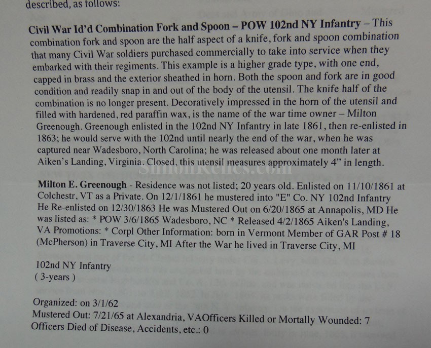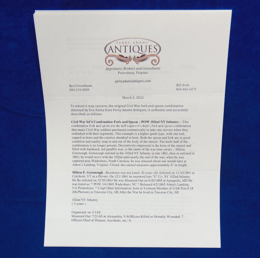 Civil War Id'd Combination Fork and Spoon - POW 102nd NY Infantry