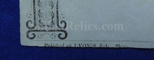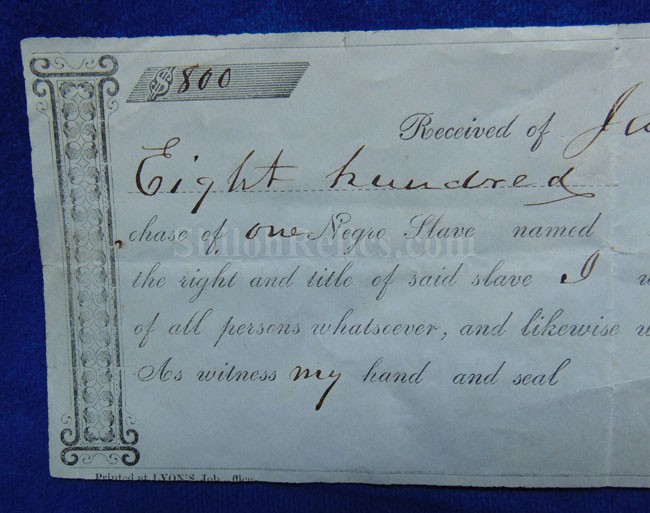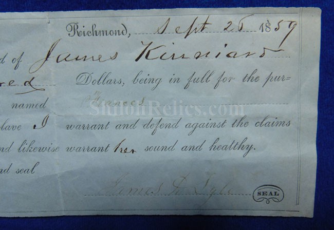 This is a superb original example of a scarce slave bill of sale from Virginia just before the Civil War. This one is clearly dated in fine old in from September 25th 1859. The fine quality blue pre-printed paper has the blanks filled in in the clear brown ink. The receipt is for the large sum of $800 for "...one Negro named Frances" and was paid by James Kinniard to James D. Lyle. The James D. Lyle recorded here is likely James Davidson Lyle (1821-1862), the son of James Lyle (1798-1850), who was an associate of Thomas Jefferson. Lyle's ancestral plantation was located just south in Chesterfield County, where he enslaved 9 people by the year 1820, and about 70 by the time of his death in 1850. His son, James Davidson Lyle, appears to have died serving in the Confederate States Army as part of the 16th Virginia Infantry Regiment. He is buried in Hollywood Cemetery in Richmond, VA.. On thing that is interesting is that on the lower portion where it is printed about warranting the slave to be "...sound and healthy." The paper measures approximately 7-3/4ths by 3 inches in overall size, which is just the right size for framing. This is a fine piece of antebellum history!