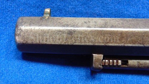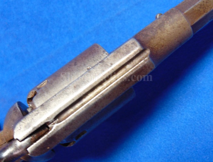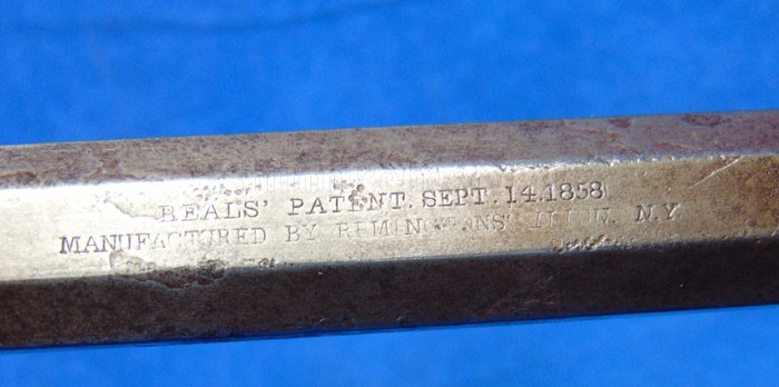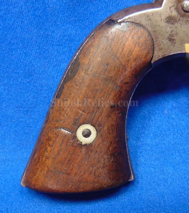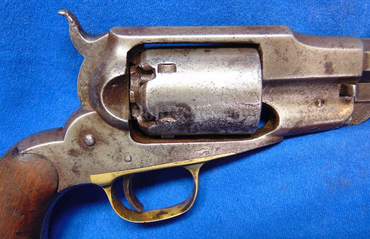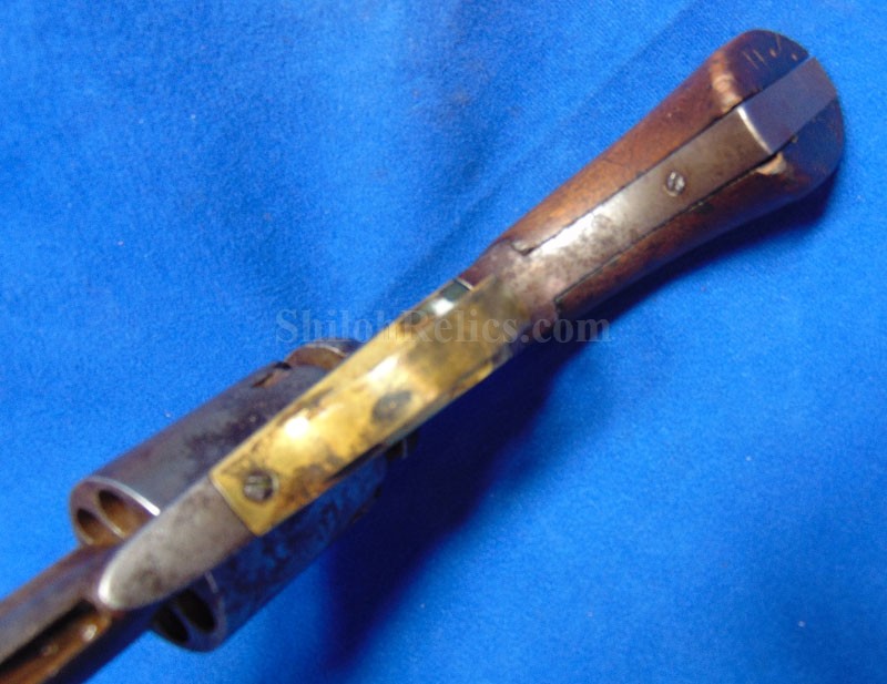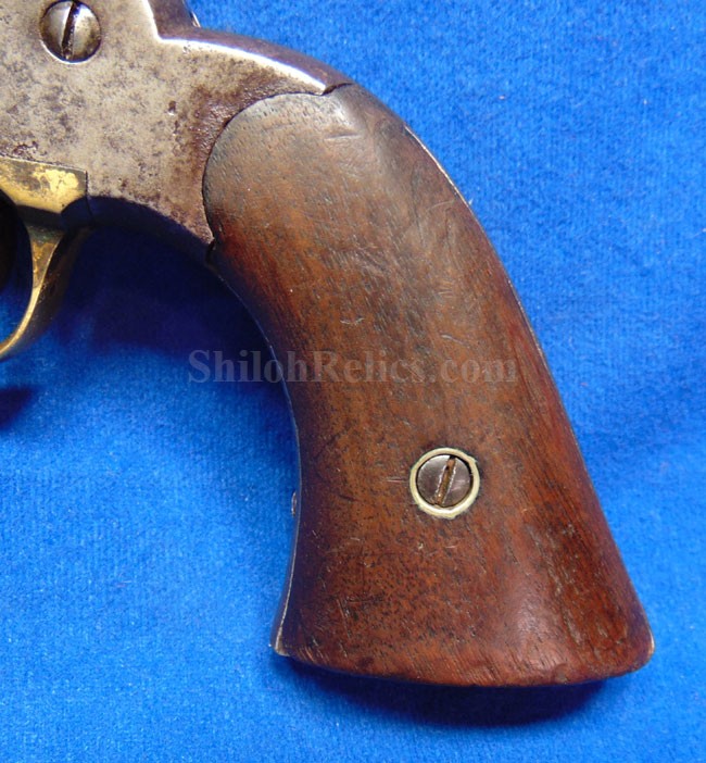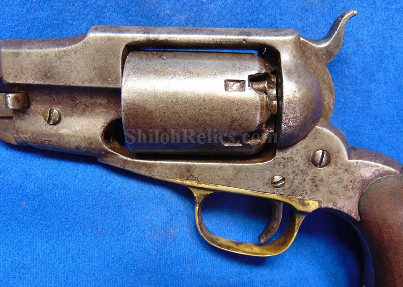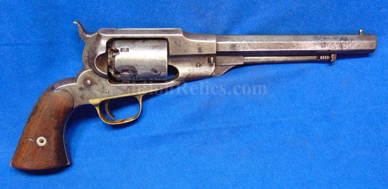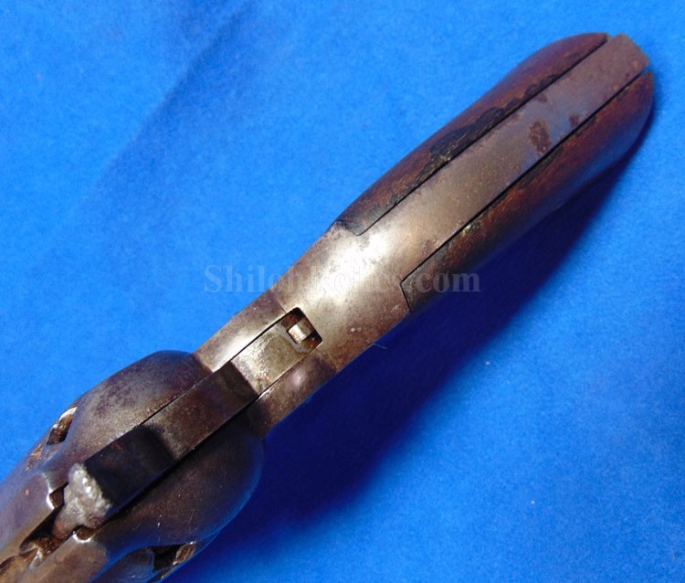 This is a nice authentic and tough to find .36 caliber Beals model of Remington revolver. This is the early pattern of .36 caliber Remington revolver. The metal on the gun has a darker light gray tone all over that is pleasing to the eye. You can tell that this one saw service. It has the Beals Patent mark across the top of the barrel to go along with the Remington maker's mark and Ilion, New York production location. At the end of the barrel it has the brass sight intact. It has matching serial numbers of 11,706, which is in the latter part of their production. There were only 14,500 of these Beals model revolvers made during their 1861-1862 production. The action works well on all positions. On the handle of the gun it has the 2-piece walnut grip intact and they grips have a pleasing well worn look all over. This is a very attractive and scarce .36 caliber Remington Beals revolver.