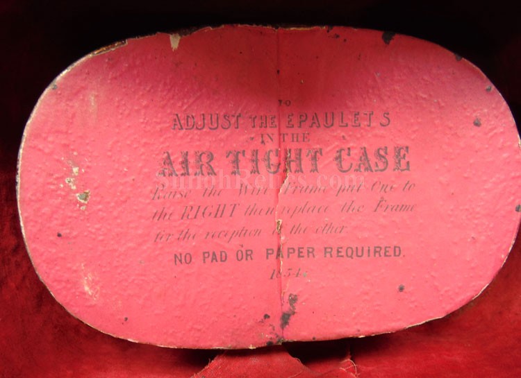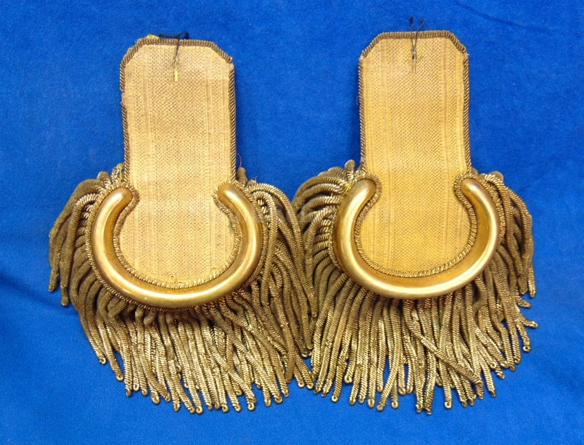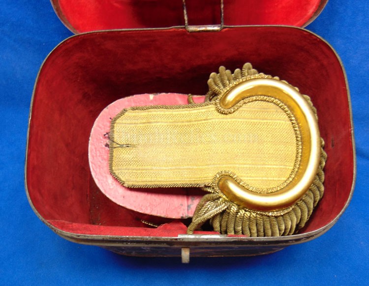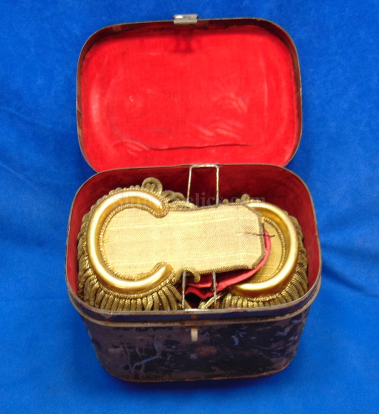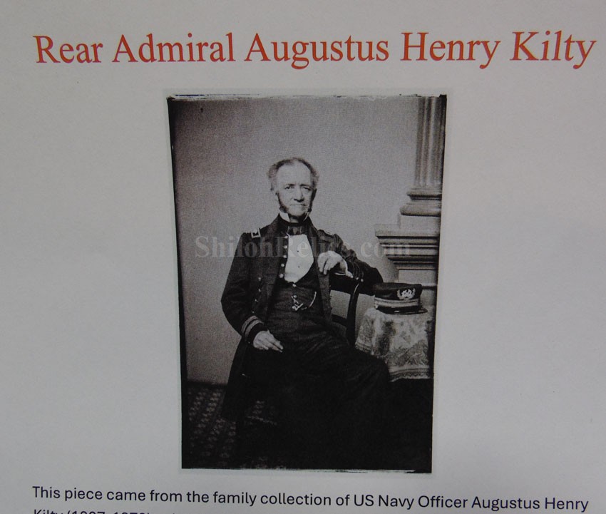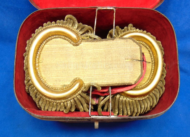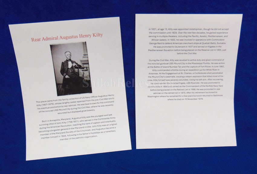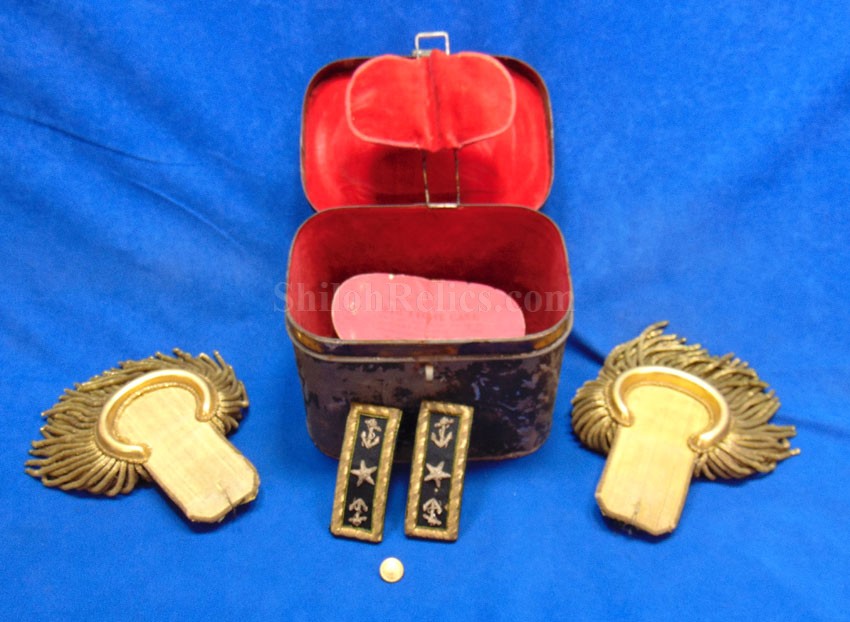 Here are a group of pieces from the estate of a long serving sailor from the United States. These items came from the estate of Augustus Kilty. Augustus Henry Kilty (1807–1879), whose lengthy career spanned from the pre-Civil War era to his eventual promotion to rear admiral. He was best known for his command of the ironclad USS Mound City during the Civil War, where he was severely wounded but displayed great bravery. Born in Annapolis, Maryland, Augustus Kilty was the youngest and last surviving child of John Kilty (1756-1811), who served in the Continental Army during the American Revolution, reaching the rank of captain and eventually becoming a brigadier general in the Maryland militia. John Kilty was an original member of the Maryland Society of the Cincinnati, and Augustus became a member himself in 1844, following in his father's footsteps as a hereditary member of the patriotic organization. In 1821, at age 13, Kilty was appointed midshipman, though he did not accept the commission until 1824. Over the next few decades, he gained experience serving in multiple theaters, including the Pacific, Asiatic, Mediterranean, and African waters. In 1832, he was involved in operations with Commodore George Reid to defend American merchant ships at Quallah Batto, Sumatra. He was promoted to lieutenant in 1837 and served on frigates in the Mediterranean Squadron before being placed on the Reserve List in 1855, just before the Civil War. During the Civil War, Kilty was recalled to active duty and given command of the ironclad gunboat USS Mound City in the Mississippi Flotilla. He saw action at the Battle of Island Number Ten and the capture of Fort Pillow. In June 1862, Kilty commanded a flotilla during an expedition up the White River in Arkansas. At the Engagement at St. Charles, a Confederate shell penetrated the Mound City's casemate, causing a steam explosion that killed most of his crew. Kilty himself was severely wounded, losing his left arm. After recovering, he commanded the ironclad frigate USS Roanoke. He was promoted to commodore in 1866 and served as the Commandant of the Norfolk Navy Yard before being placed on the Retired List in 1868. He was promoted to rear admiral on the retired list in 1870. After his retirement he moved to Washington where he remained for a few years, but soon returned to Baltimore where he died on 10 November 1879.This group comes with a cased set of officer's epaulets. The set is for a lower ranking officer because they do not have the insignia on the center of the golden color top. Each has a nice used appearance with the bullion fringe and the golden silk undersides. They come displayed in the original Jappanned black tin carrying case. the case retains some of the original paint on the sides. When you open the case you see the red lining and the innermost compartment is covered with the 1854 dated paper label. When I took the lid off of the innermost compartment, I found Kilty's original pair of shoulder insignia. These insignia have the distinct design of being made for a U.S. Navy Rear Admiral with the star in the center and flanked by the anchors. These are not as old as the epaulets and would have been his during the time he held the rank of Read Admiral which would have been 1870 until 1879. There was also a vest size Civil War era navy button made by Horstmann & Allien. You get the cased epaulets, the shoulder insignia and the button for $995.00.