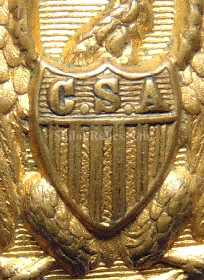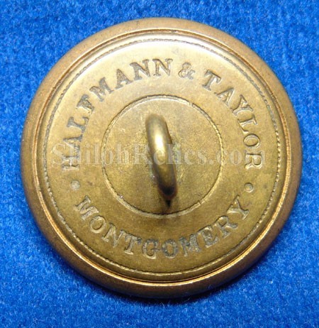 This is on that you very seldom get a chance to own. It is a very attractive Confederate staff officer's coat button. It has the eagle with the "droop" style downturned wings. In the shield on the eagle's chest you can clearly see the large shield with the bold "CSA' letters. The eagle is on a lined background and around the edges it has 11 six pointed stars. This is the pattern that is listed as CS1 in Albert's button book and as CS201a4 in Tice's button book. This is one of the most beautiful of all Civil War production Confederate buttons. This style adorned many of the coats of the highest ranking Southern leaders. The reverse of this button has the original shank intact and perfectly straight. It has the desirable retailer's mark of "HALFMANN & TAYLOR MONTGOMERY". They were high end retailers in Montgomery, Alabama. They would have imported this beautiful button from England where it was manufactured so it could be purchased by a Southern officer. The button has a great look and you can tell that this is one that was actually worn but well taken care of. You will have a hard time finding a better button looking than this beauty!
