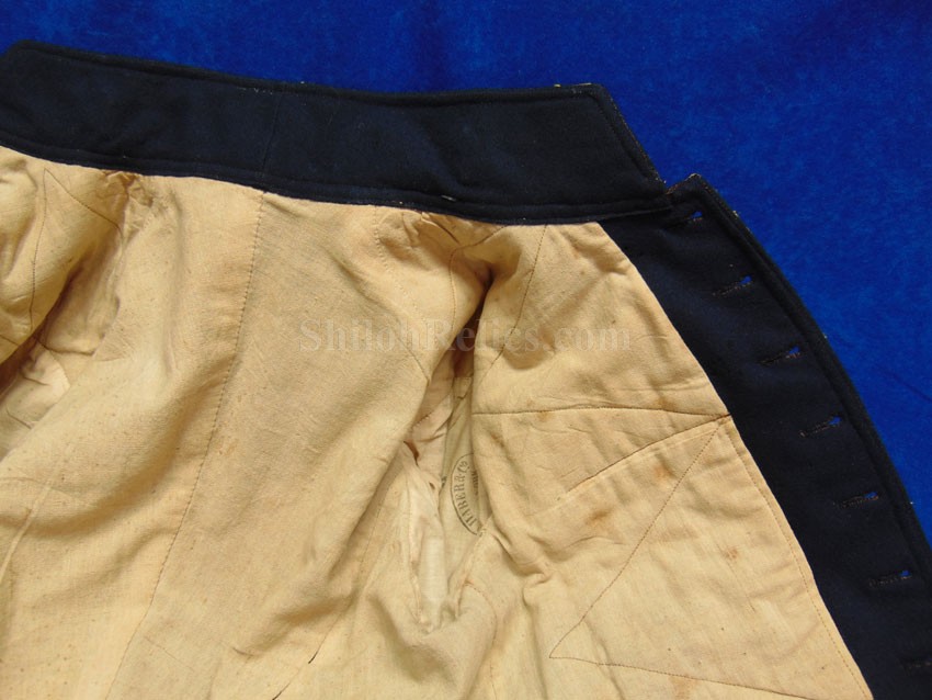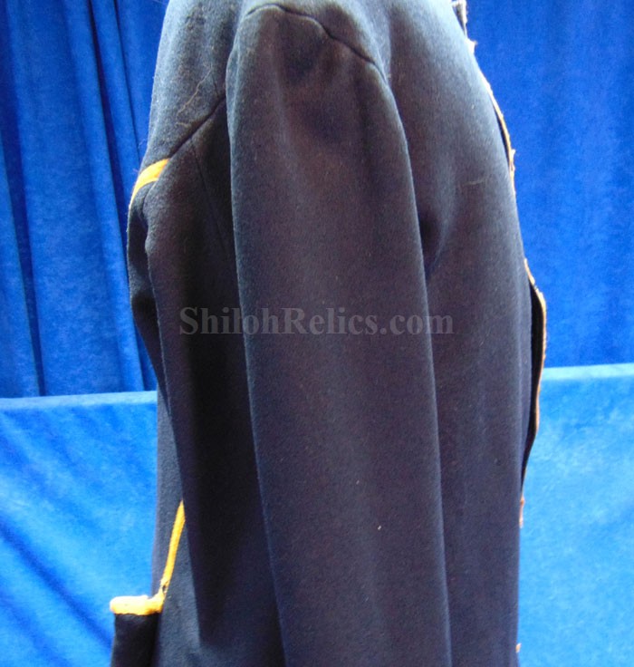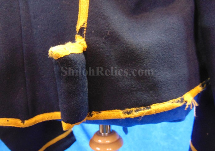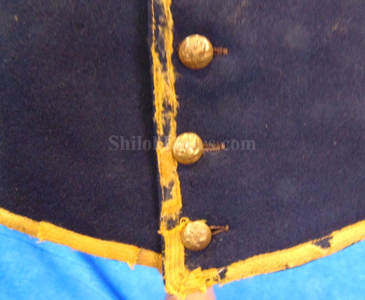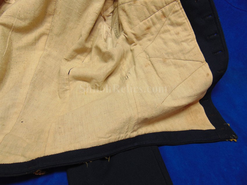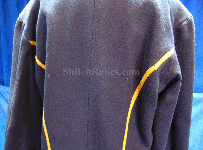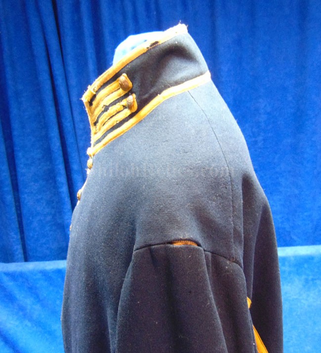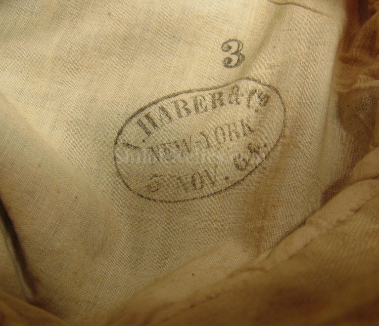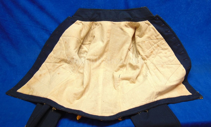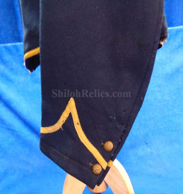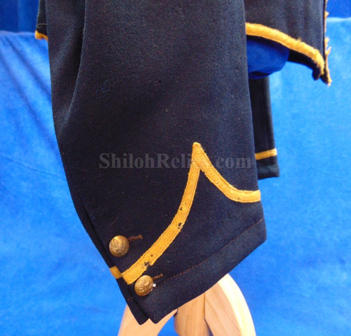 If you have wanted a nice displaying Civil War cavalry uniform with a cool look, then this is for you. This is the classic uniform that is referred to by collectors as the "Shell" pattern coat. This is the style that was worn by the regular fighting men of the cavalry branch of service. It has the blue wool to the body of the coat. The body looks nice as you can see with the standard golden cavalry trim. The trim displays well with some losses as you see in the images. It has the golden trim on the collar. It is made without the thick tall pillows on the back of the coat that were designed to hold the soldier's belt up. It has all of the original general service eagle buttons going down the front and also on the cuffs of the coat. When you open the coat up, you see the original lining with a pleasing cream color to the material. In one sleeve, there are the clear original maker stampings of Haber, Isaac & Company of New York as well as the stamped date of the contract of "3 NOV. 1864". The maker book states that Haber had contracts to make 56,800 cavalry jackets in their contract of December of 1863 and November of 1864. This one is interesting and displays beautifully!
