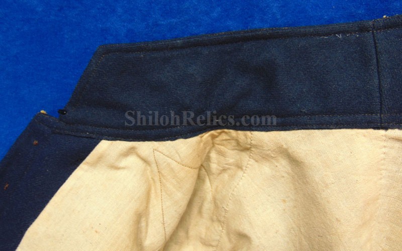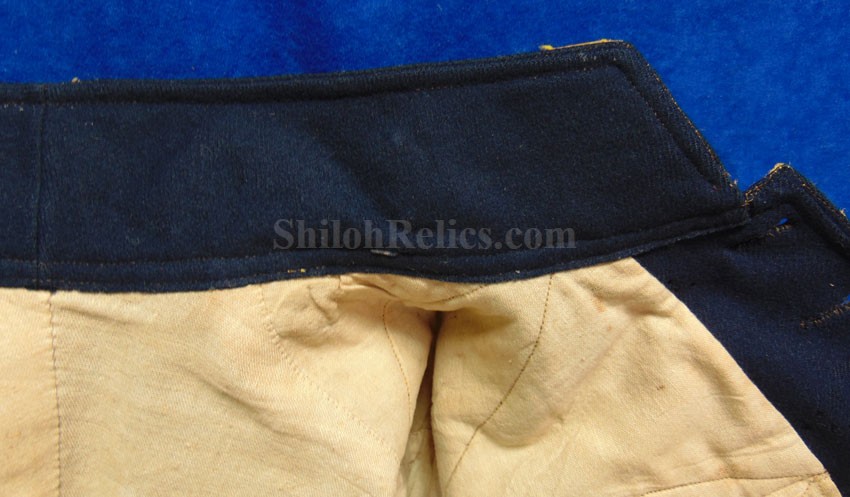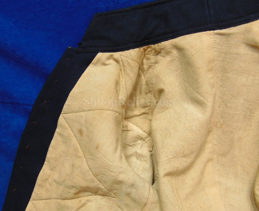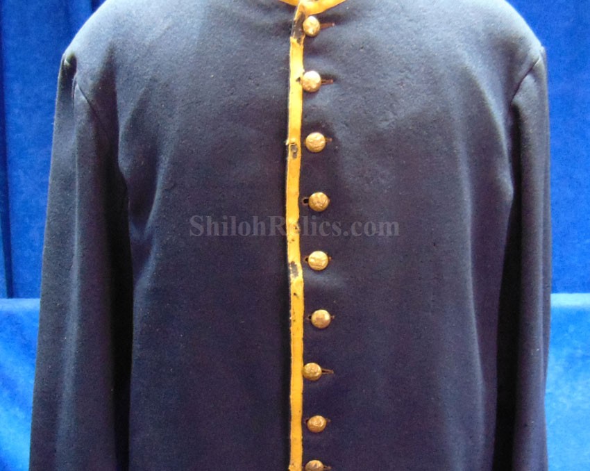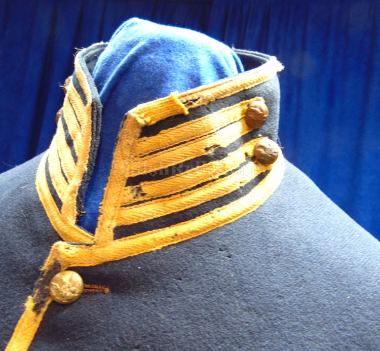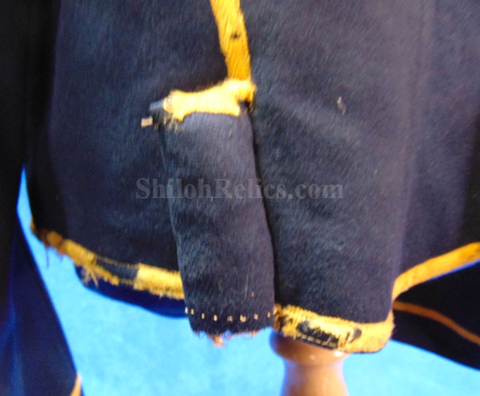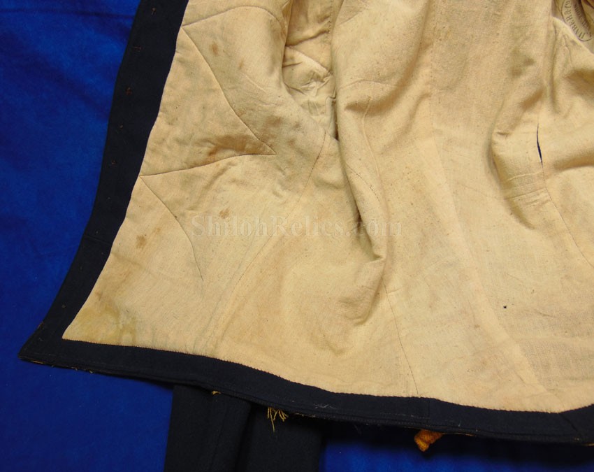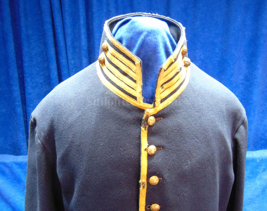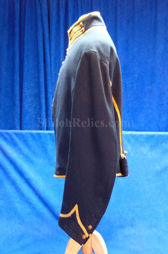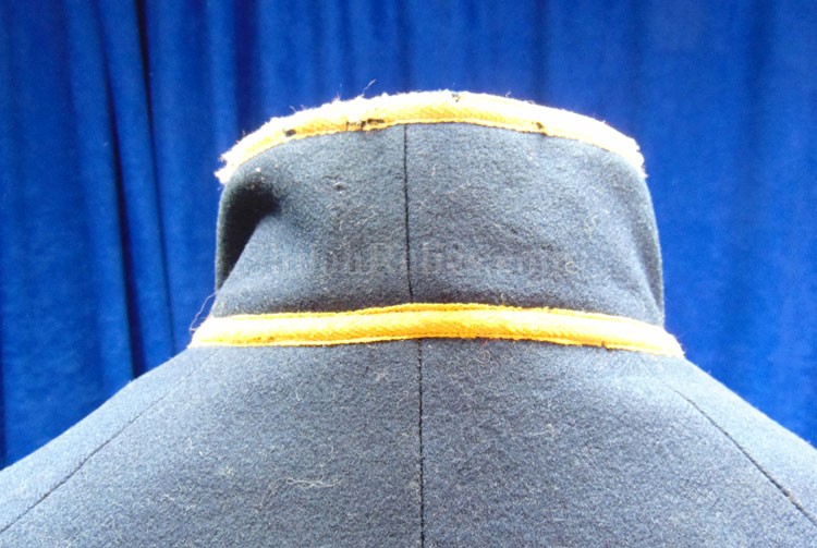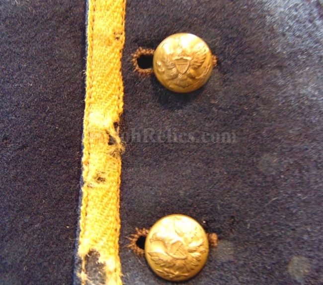 If you have wanted a nice displaying Civil War cavalry uniform with a cool look, then this is for you. This is the classic uniform that is referred to by collectors as the "Shell" pattern coat. This is the style that was worn by the regular fighting men of the cavalry branch of service. It has the blue wool to the body of the coat. The body looks nice as you can see with the standard golden cavalry trim. The trim displays well with some losses as you see in the images. It has the golden trim on the collar. It is made without the thick tall pillows on the back of the coat that were designed to hold the soldier's belt up. It has all of the original general service eagle buttons going down the front and also on the cuffs of the coat. When you open the coat up, you see the original lining with a pleasing cream color to the material. In one sleeve, there are the clear original maker stampings of Haber, Isaac & Company of New York as well as the stamped date of the contract of "3 NOV. 1864". The maker book states that Haber had contracts to make 56,800 cavalry jackets in their contract of December of 1863 and November of 1864. This one is interesting and displays beautifully!