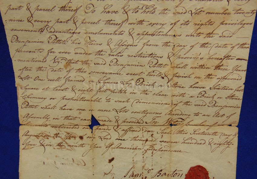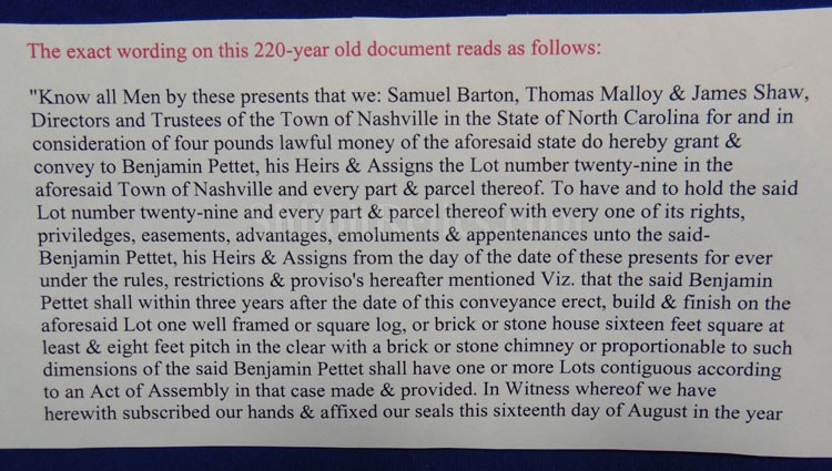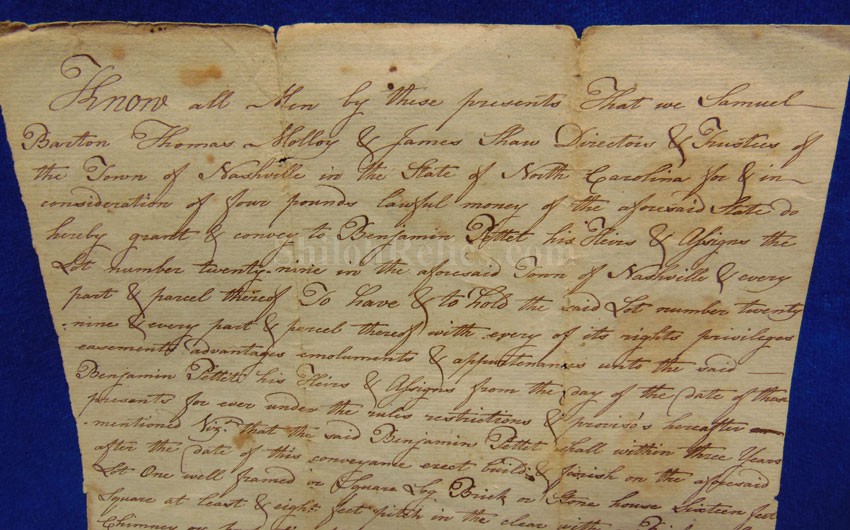 sixteenth day of August in the year 1784." In 1784, Market Street in Nashville was located along the Cumberland River and is now known as 2nd Avenue, serving as a hub for early commerce with warehouses, while Commerce Street likely paralleled it or was nearby, forming the core of the young settlement's riverfront trade, as Nashville (then Nashborough) was established right on the riverbanks for its strategic importance. This Lot #29 area is near what is now the Hard Rock Cafe and where the Wild Horse Saloon used to be if my map reading is correct. The document measures 12 inches by 7-1/4th inches in overall size. It is very legible with the minor paper losses and some fold line separations. This is an amazing piece of Nashville history!