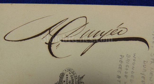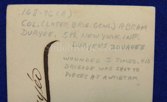 New York. But what makes this one extra special is that it is boldly signed in dark ink "A. Duryee" in his distinctive fancy script. There is also a more modern pencil notation that states "COL. (LATER) BRIG. GENL) ABRAM/DURYEE, 5th NY INF./DURYEE'S ZOAUVES/WOUNDED 5 TIMES. HIS/BRIGADE WAS SHOT TO PIECES AT ANTIETAM". It displays quite well as you see.