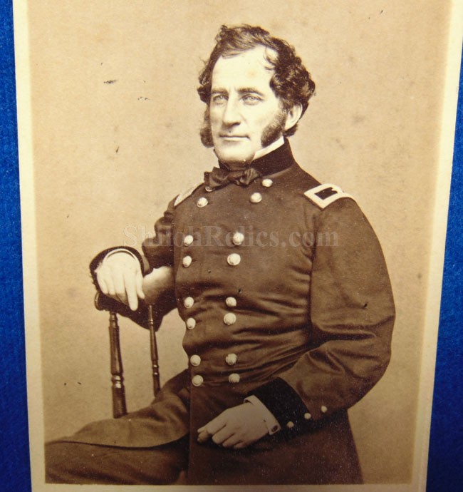 CDV image and it is autographed! It is one showing the famous Union General Abram Duryee. Abram Duryée (April 29, 1815 – September 27, 1890) was a Union Army general during the American Civil War, the commander of one of the most famous Zouave regiments, the 5th New York Volunteer Infantry. Duryée raised a new regiment, the 5th New York Volunteers, in less than a week. He became its colonel on May 14, 1861. It was one of the several Zouave units that were formed in the mid-19th century. "Duryée's Zouaves", as they became known, fought at Big Bethel. Duryée was appointed brigadier general, on August 31, 1861, to rank from that date. President Abraham Lincoln submitted the nomination to the U.S. Senate on December 21, 1861, and the Senate confirmed the nomination on February 3, 1862. Duryée was given command of a brigade in the division under General James B. Ricketts. He later fought in the Battle of Cedar Mountain, Second Battle of Bull Run, and several others. At the Battle of Antietam, he succeeded Ricketts as division commander, when the latter was wounded. He was not afraid to be in the thick of the action; he was wounded at Second Bull Run, South Mountain, and Antietam. After Antietam, Duryée went on a short leave of absence, and, when he returned, was disheartened to find his brigade under the command of Brig. Gen. John Gibbon, who was his junior by date of rank. He resigned on January 5, 1863, after the army rejected his claims to his old command. Despite this, on July 20, 1866, President Andrew Johnson nominated Duryée for appointment to the brevet grade of major general of volunteers, to rank from March 13, 1865, and the U.S. Senate confirmed the nomination on July 26, 1866. He was also elected by the 71st New York Infantry Regiment as their colonel and as Brigadier General by the 4th New York Brigade, both of which he declined. After the war he was New York City Police Commissioner. On the back of the image, it has the studio mark of Gurney & Son of
