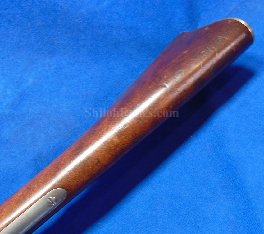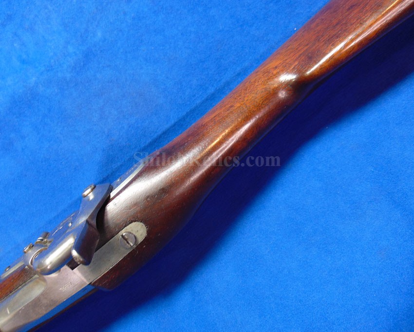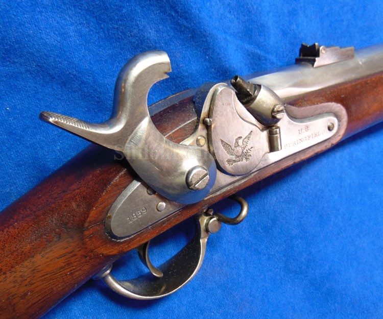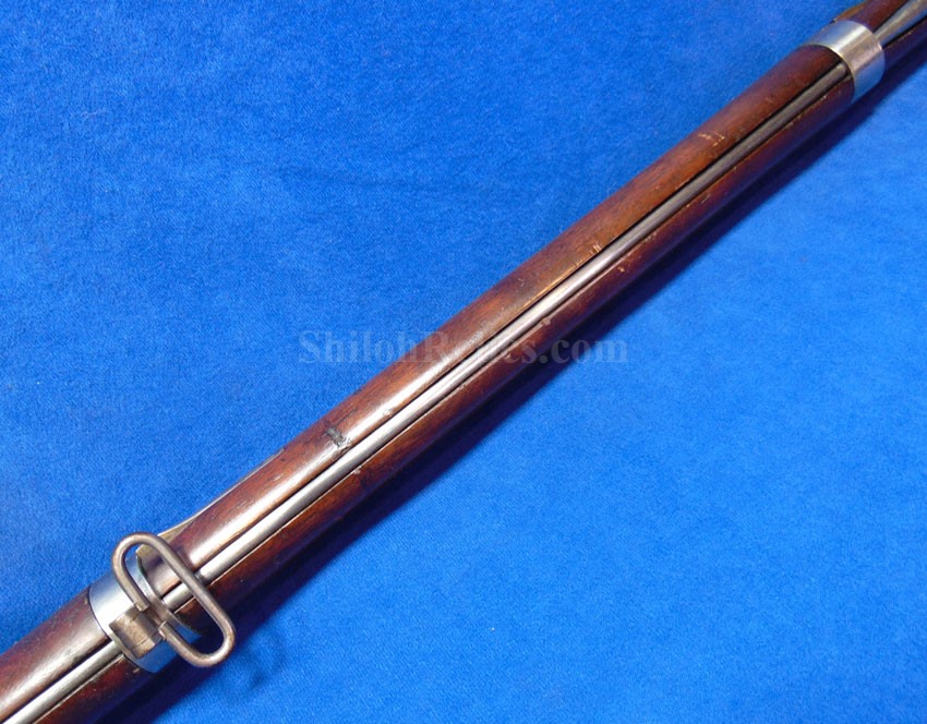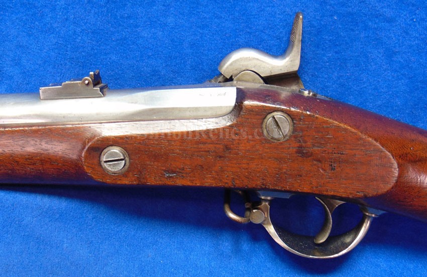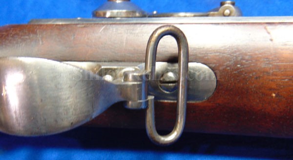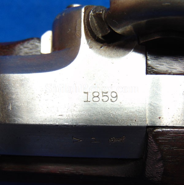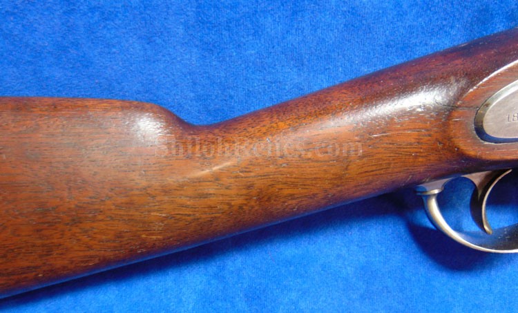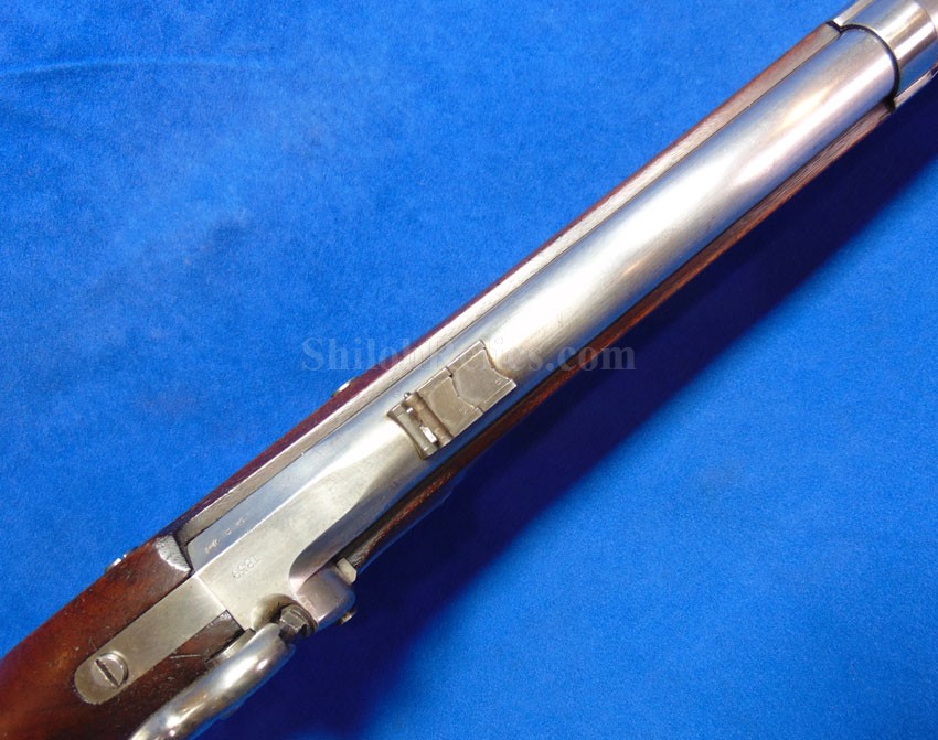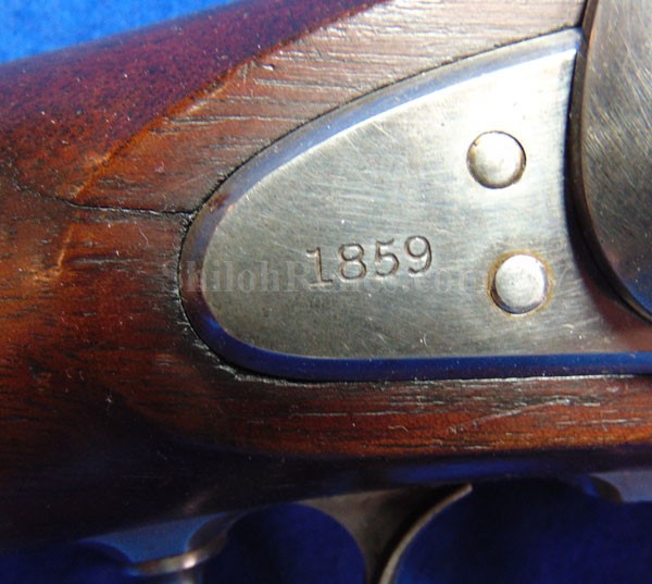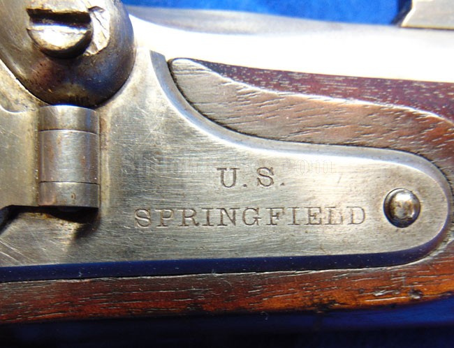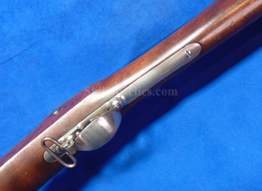 Here is a gun that you very seldom see offered these days and this one is a beauty! It is an original U.S. model 1855 percussion rifle musket. This one was made in 1859 and is deeply marked as such on the lockplate behind the hammer. The front of the lockplate has the stamping from the famous U.S. Springfield Arsenal. You can tell this model 1855 guns from a mile away because of the door that it on the side of the lockplate. This door opens up to reveal the Maynard tape primer system inside. Inventors were trying to figure a way not to have to use the percussion caps that were so widely utilized during his time period. One of the ways they tried was this Maynard system. Instead of the metal percussion capo they used a roll of paper that had the charges spaced apart on roll, sort of like modern children's cap gun rolls. They had a spring that would feed the roll up underneath the nipple when the gun was cocked back. This worked well unless you were in back weather, or the rolls had been wet at one time, or the feeder spring on the inside broke, or one of dozens of other reasons. This is why this design was discontinued with the model 1861 rifle that came next. This one has had the mechanical parts for the Maynard system removed from inside the lockplate. The regular mechanical parts are present and it catches on both of the positions just as it should. The door opens as it should. The barrel is full-length with the front and rear sights intact and the rear sight is the shorter range version. At the breech of the gun you can still clearly see the matching and correct "1859" production date and you can see the government inspector stamps. The inside of the barrel you can still see the original rifling going all the way down with the bore being moderately oxidized with good rifling. The stock has a very pleasing look all over with rich color to the walnut wood. On the flat of the stock opposite of the lockplate you can see the pair of the inspector cartouches. It has the script "JS" cartouche is present opposite the lock, the mark of Springfield Arsenal inspector James Stillman. It has both of the original sling swivels intact on the underside of the gun. In the channel underneath the barrel it has the original ramrod that is full-length. The nose cap is the version that is made of iron. This is a cool looking gun from all angles that is definitely a keeper!