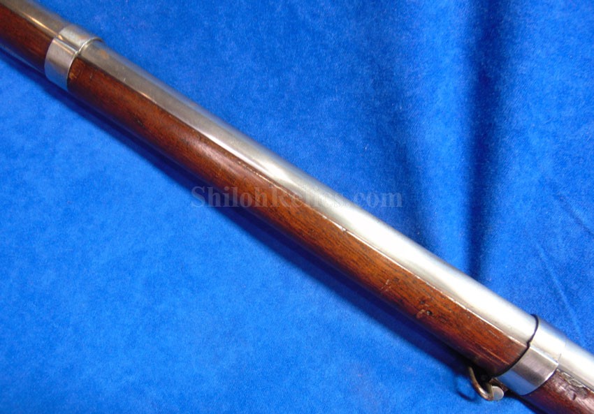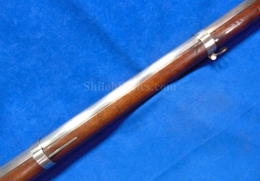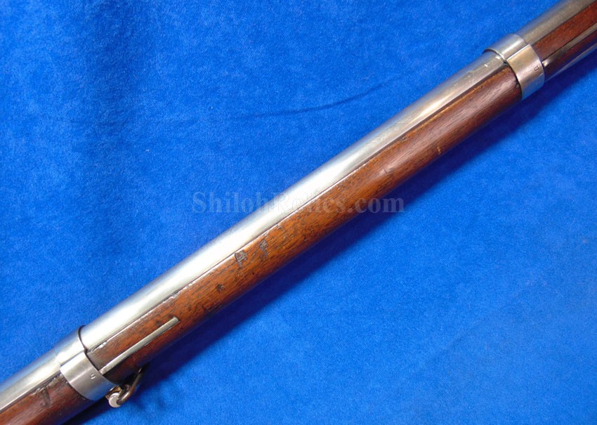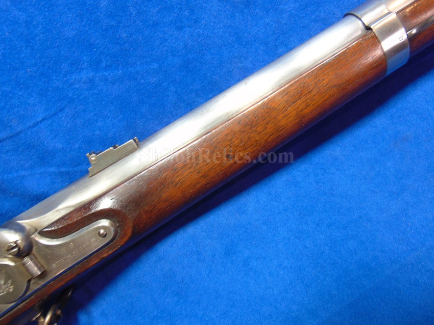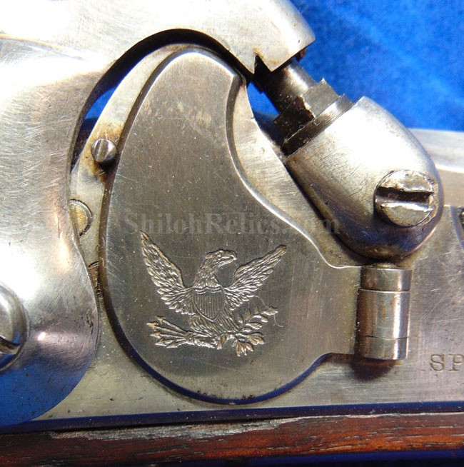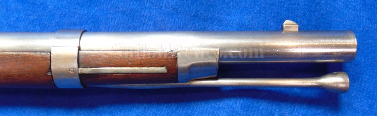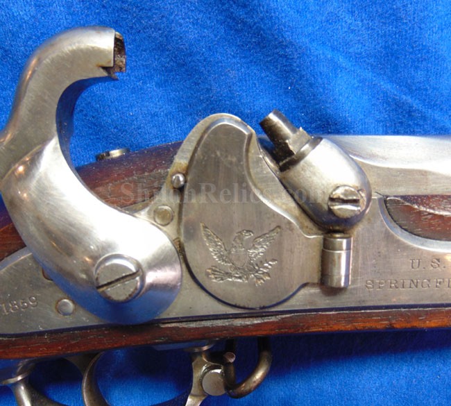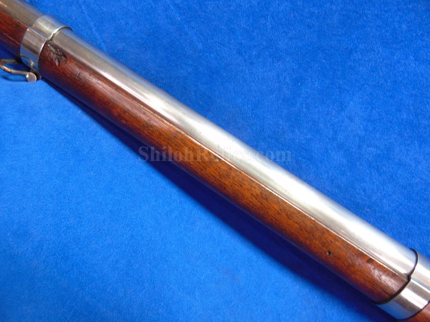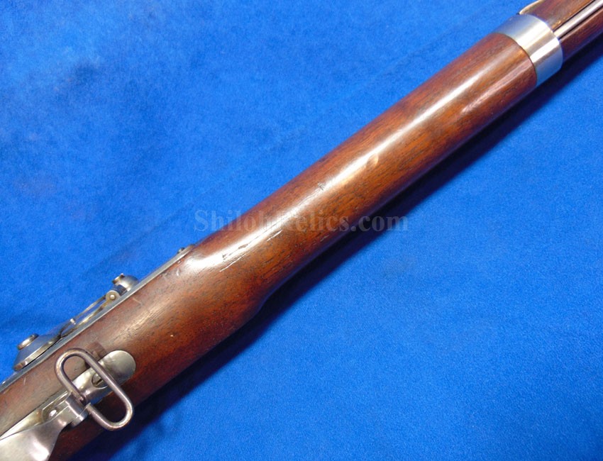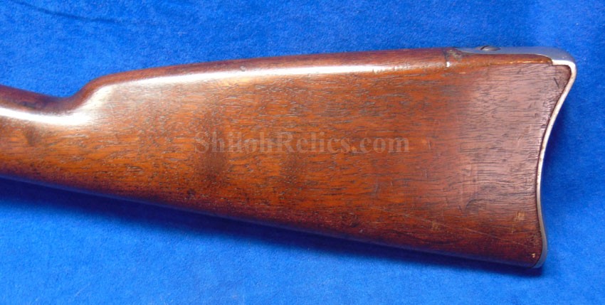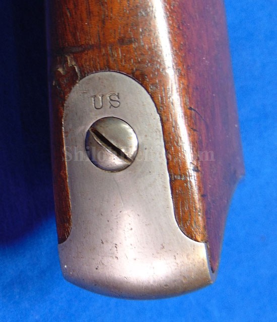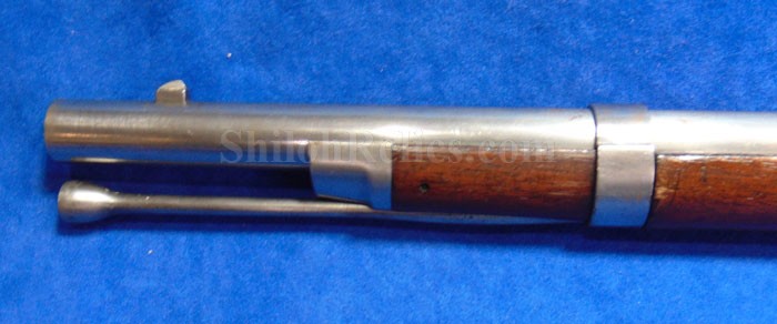 Here is a gun that you very seldom see offered these days and this one is a beauty! It is an original U.S. model 1855 percussion rifle musket. This one was made in 1859 and is deeply marked as such on the lockplate behind the hammer. The front of the lockplate has the stamping from the famous U.S. Springfield Arsenal. You can tell this model 1855 guns from a mile away because of the door that it on the side of the lockplate. This door opens up to reveal the Maynard tape primer system inside. Inventors were trying to figure a way not to have to use the percussion caps that were so widely utilized during his time period. One of the ways they tried was this Maynard system. Instead of the metal percussion capo they used a roll of paper that had the charges spaced apart on roll, sort of like modern children's cap gun rolls. They had a spring that would feed the roll up underneath the nipple when the gun was cocked back. This worked well unless you were in back weather, or the rolls had been wet at one time, or the feeder spring on the inside broke, or one of dozens of other reasons. This is why this design was discontinued with the model 1861 rifle that came next. This one has had the mechanical parts for the Maynard system removed from inside the lockplate. The regular mechanical parts are present and it catches on both of the positions just as it should. The door opens as it should. The barrel is full-length with the front and rear sights intact and the rear sight is the shorter range version. At the breech of the gun you can still clearly see the matching and correct "1859" production date and you can see the government inspector stamps. The inside of the barrel you can still see the original rifling going all the way down with the bore being moderately oxidized with good rifling. The stock has a very pleasing look all over with rich color to the walnut wood. On the flat of the stock opposite of the lockplate you can see the pair of the inspector cartouches. It has the script "JS" cartouche is present opposite the lock, the mark of Springfield Arsenal inspector James Stillman. It has both of the original sling swivels intact on the underside of the gun. In the channel underneath the barrel it has the original ramrod that is full-length. The nose cap is the version that is made of iron. This is a cool looking gun from all angles that is definitely a keeper!