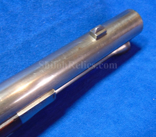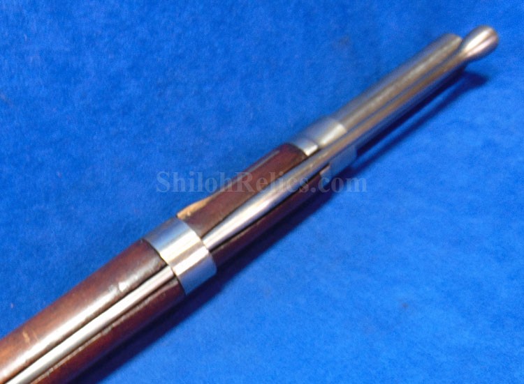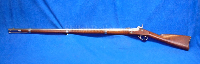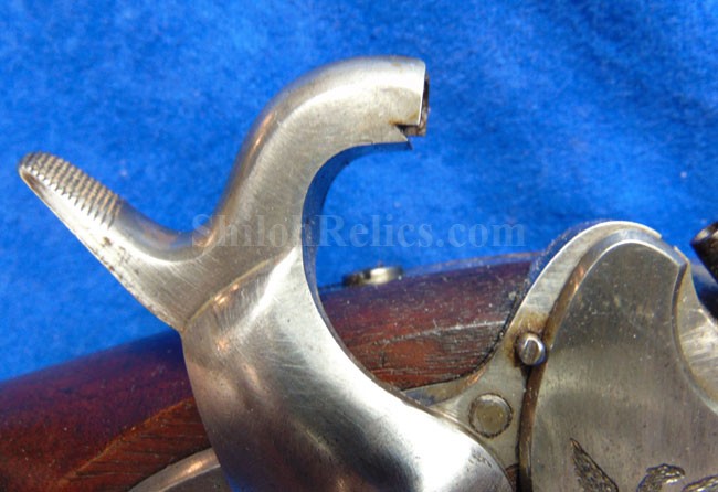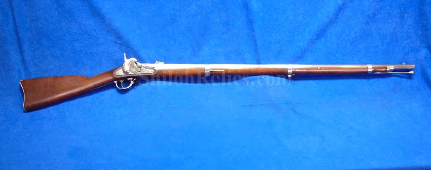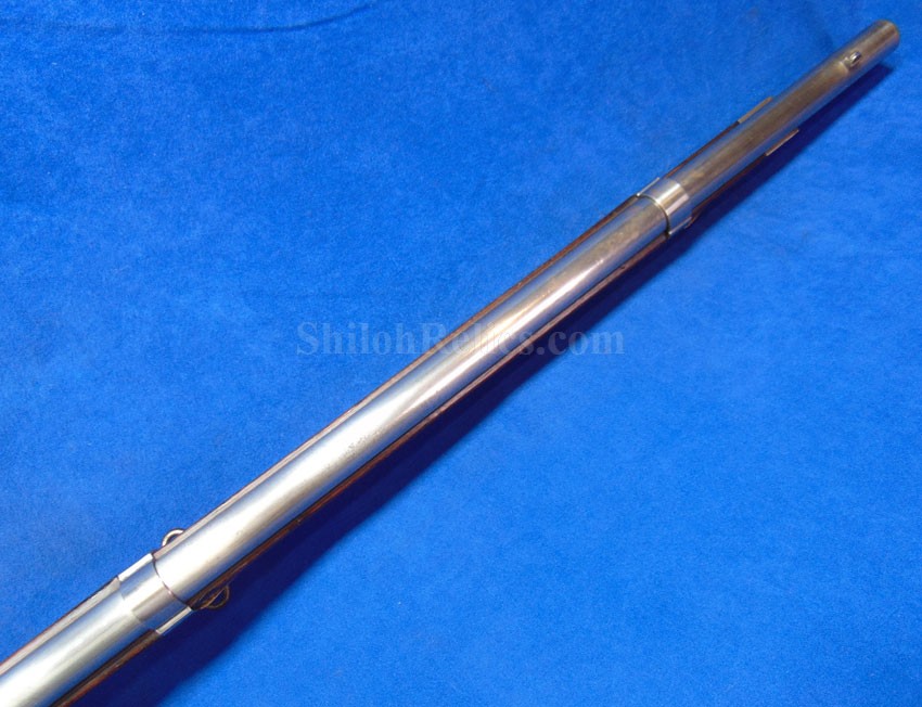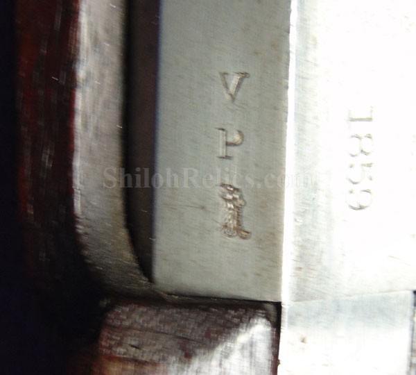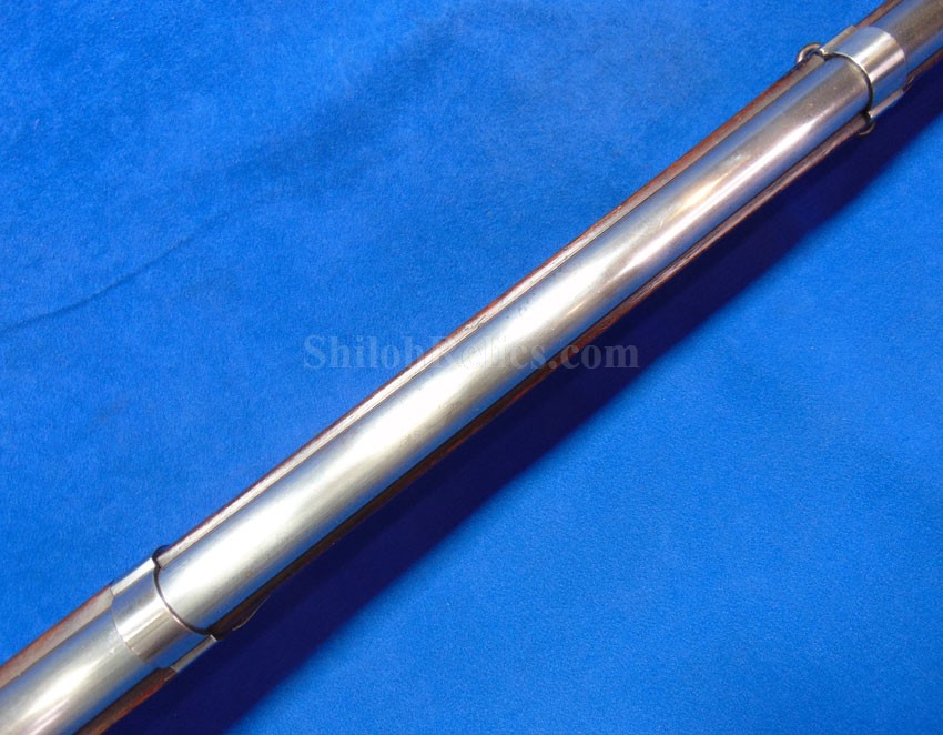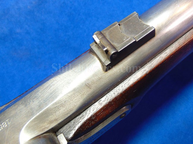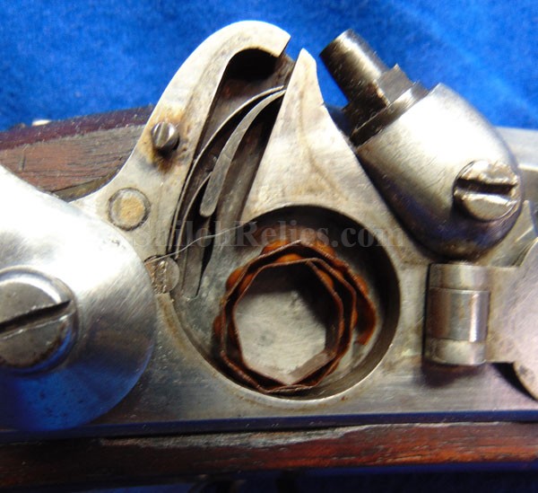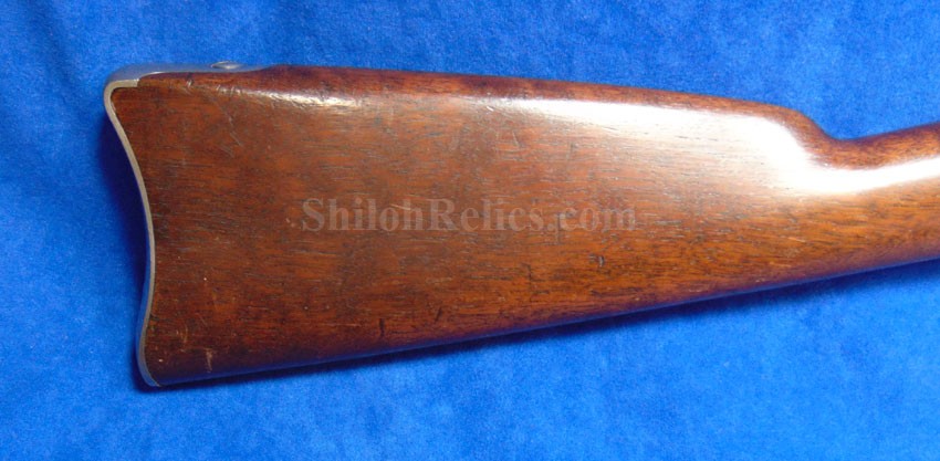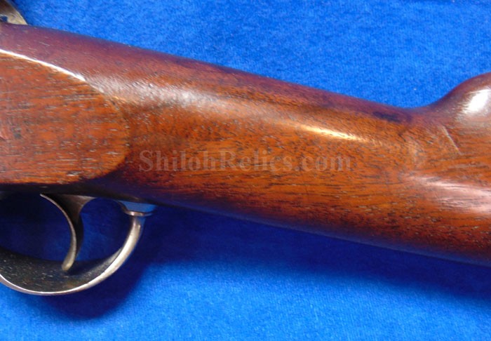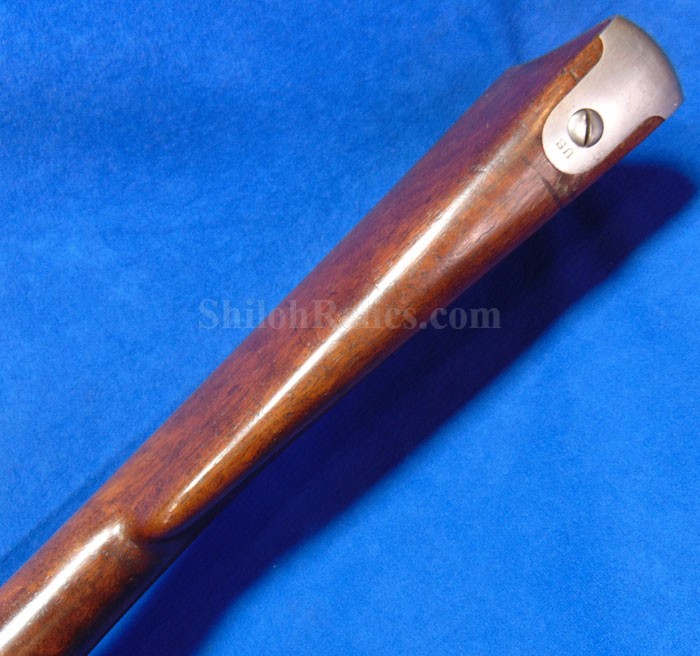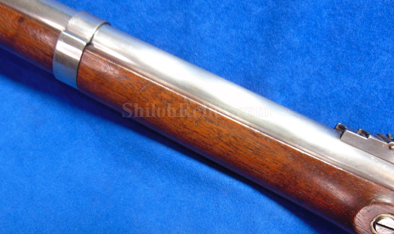 Here is a gun that you very seldom see offered these days and this one is a beauty! It is an original U.S. model 1855 percussion rifle musket. This one was made in 1859 and is deeply marked as such on the lockplate behind the hammer. The front of the lockplate has the stamping from the famous U.S. Springfield Arsenal. You can tell this model 1855 guns from a mile away because of the door that it on the side of the lockplate. This door opens up to reveal the Maynard tape primer system inside. Inventors were trying to figure a way not to have to use the percussion caps that were so widely utilized during his time period. One of the ways they tried was this Maynard system. Instead of the metal percussion capo they used a roll of paper that had the charges spaced apart on roll, sort of like modern children's cap gun rolls. They had a spring that would feed the roll up underneath the nipple when the gun was cocked back. This worked well unless you were in back weather, or the rolls had been wet at one time, or the feeder spring on the inside broke, or one of dozens of other reasons. This is why this design was discontinued with the model 1861 rifle that came next. This one has had the mechanical parts for the Maynard system removed from inside the lockplate. The regular mechanical parts are present and it catches on both of the positions just as it should. The door opens as it should. The barrel is full-length with the front and rear sights intact and the rear sight is the shorter range version. At the breech of the gun you can still clearly see the matching and correct "1859" production date and you can see the government inspector stamps. The inside of the barrel you can still see the original rifling going all the way down with the bore being moderately oxidized with good rifling. The stock has a very pleasing look all over with rich color to the walnut wood. On the flat of the stock opposite of the lockplate you can see the pair of the inspector cartouches. It has the script "JS" cartouche is present opposite the lock, the mark of Springfield Arsenal inspector James Stillman. It has both of the original sling swivels intact on the underside of the gun. In the channel underneath the barrel it has the original ramrod that is full-length. The nose cap is the version that is made of iron. This is a cool looking gun from all angles that is definitely a keeper!